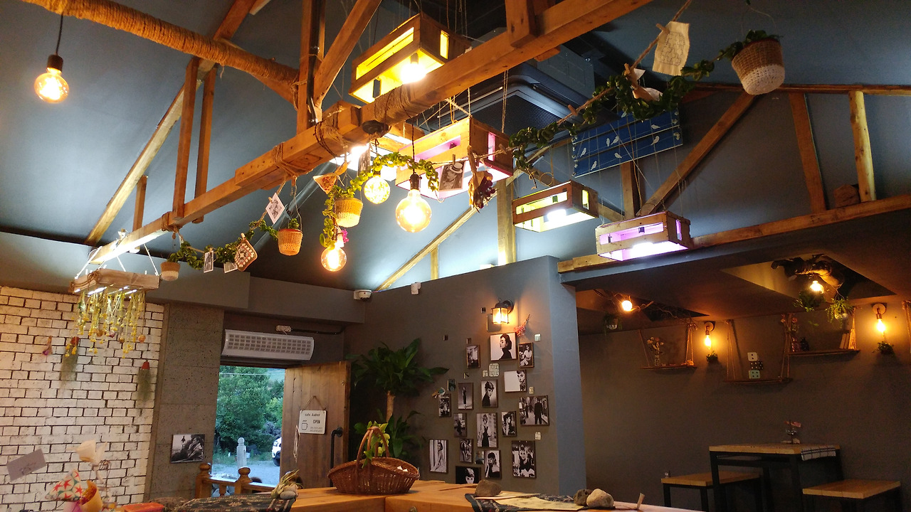 메인공간(안꺼리)엔 수제 제작한 테이블과 의자 외에 캠핑의자도 놓여있어 패러글라이딩을 하고 온 사람들에게 '레저의 연장'이란 기분을 안겨주기도 한다. 게다가 테이블이 각각 떨어져 있어 아이들과 와도 다른 이들에게 크게 방해되지 않는다. 창밖으로 마당에서 노는 아이들을 지켜봐도 좋다.