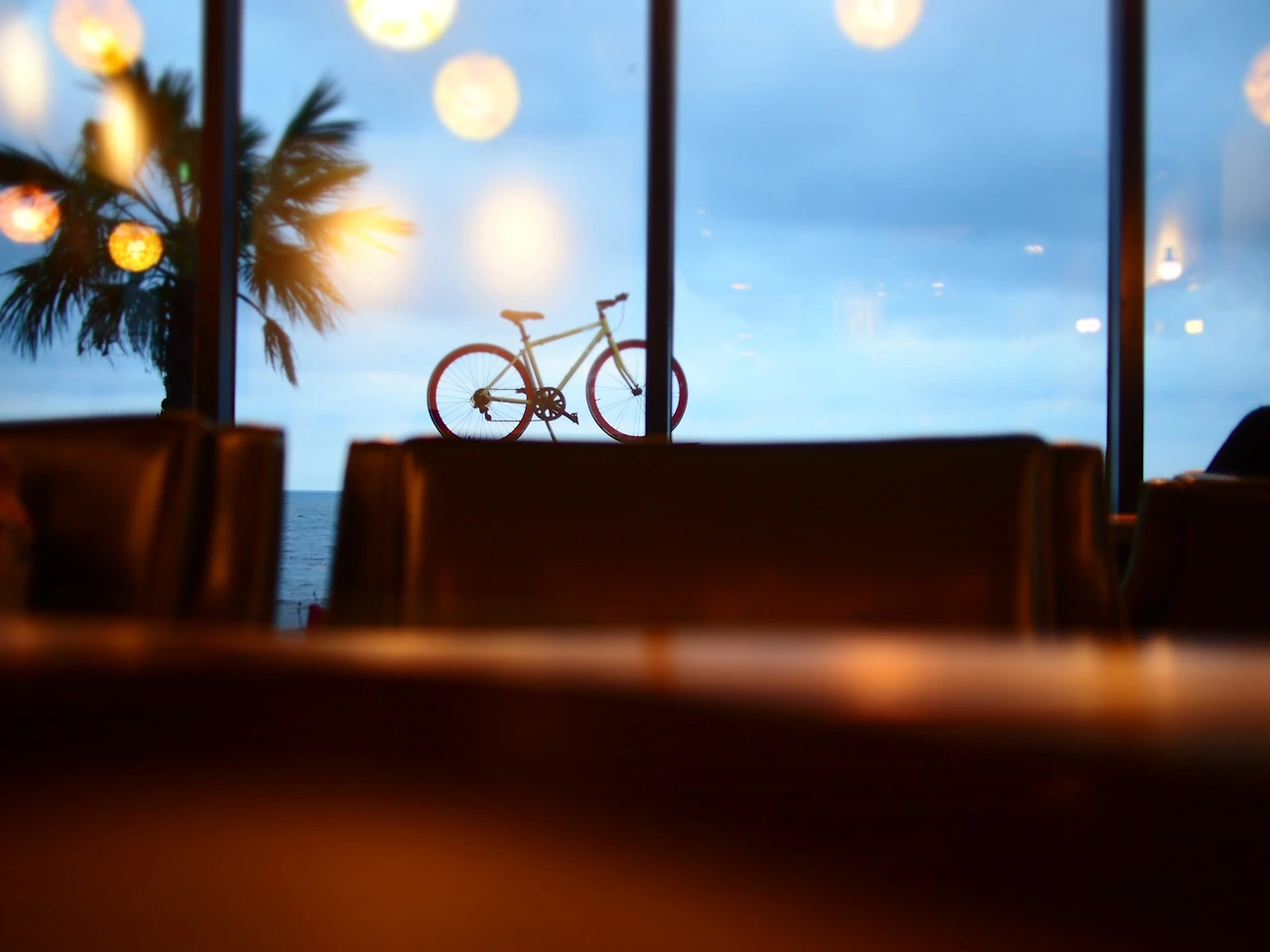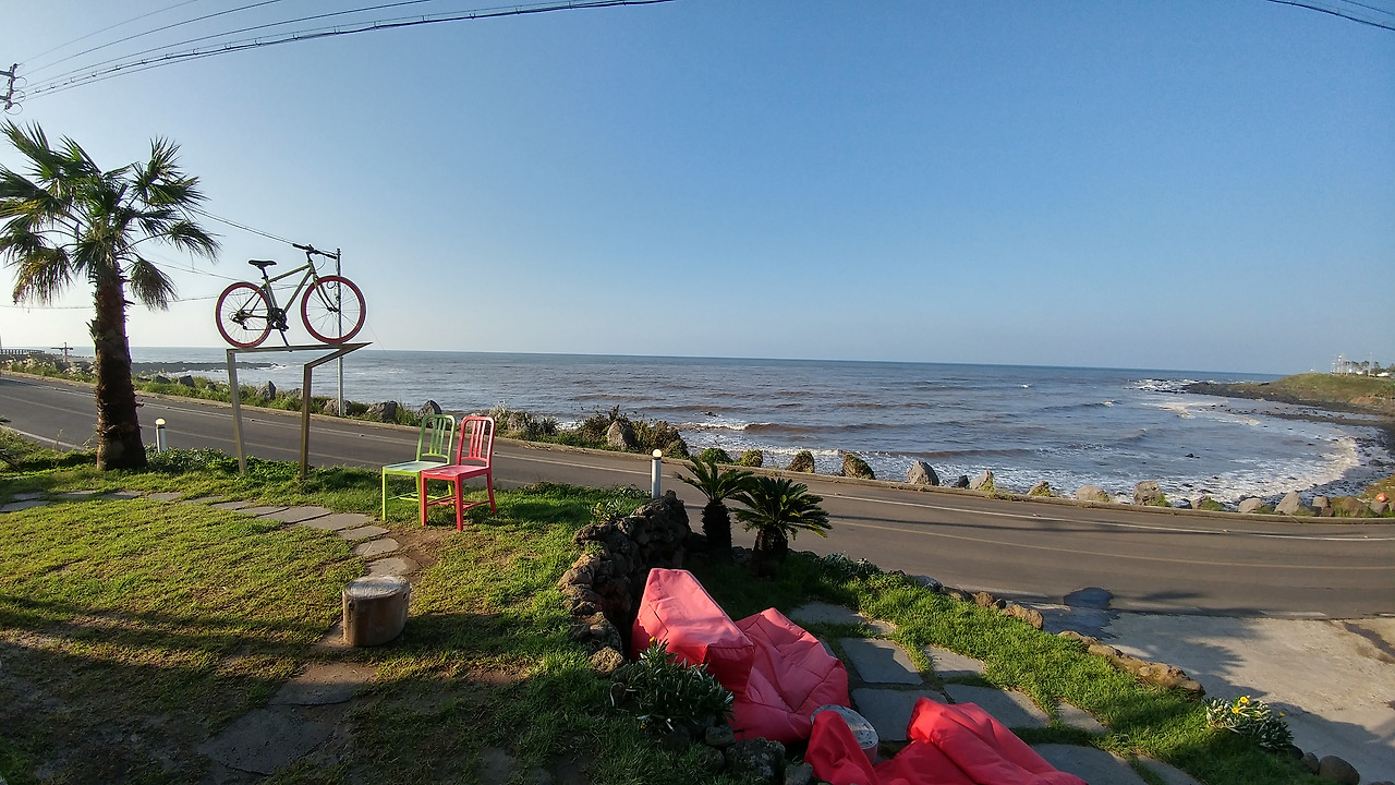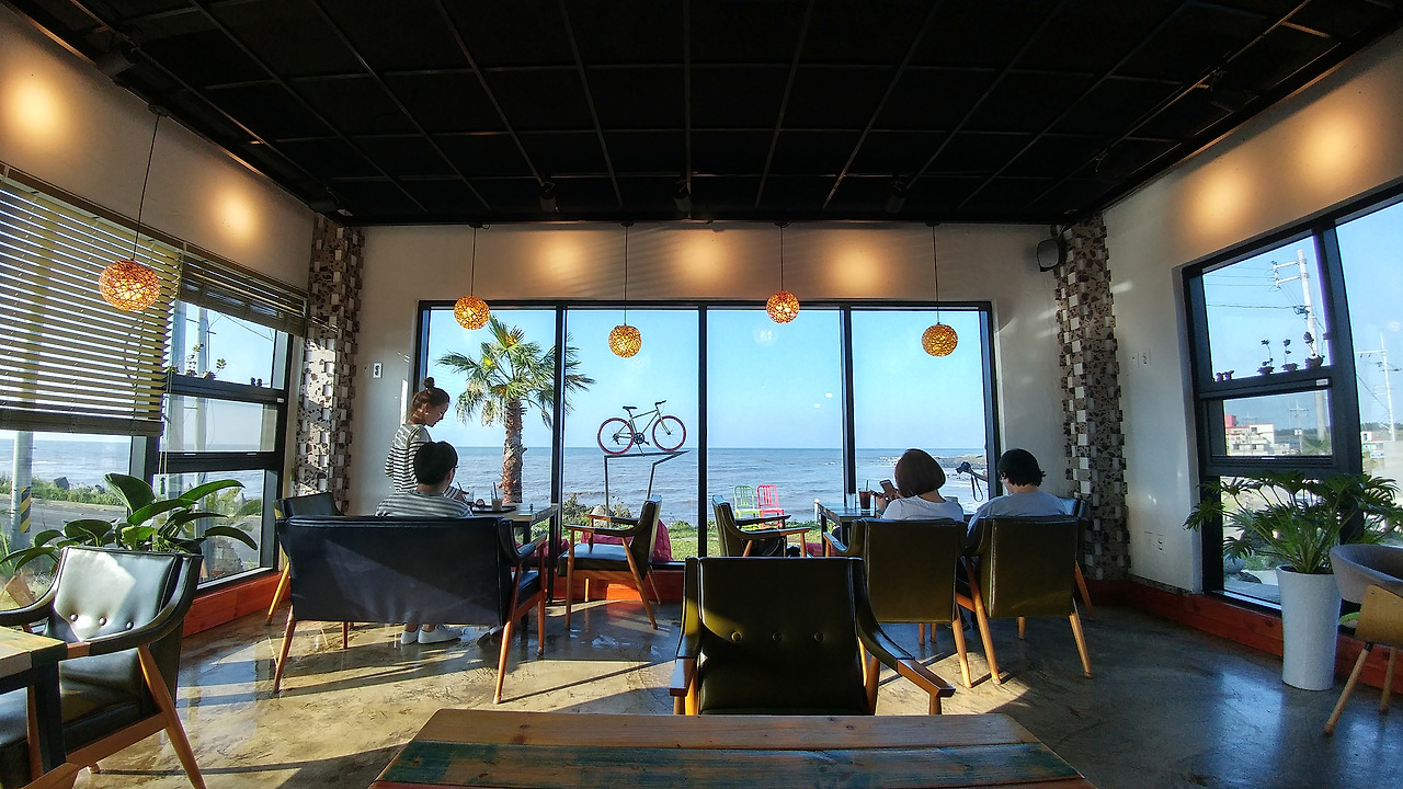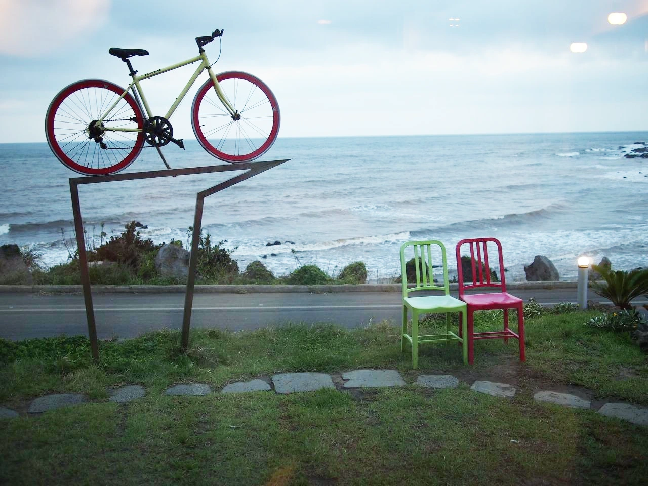 제주에서 내가 좋아하는 카페 중 하나이다. 방주교회의 ‘올리브 카페’도 너무 좋아서 일부러 찾아 2번 갔는데, 이 곳도 공항 가는 길에 자주 들렀다. 이유는 앞에 탁 트인 애월 바다를 한눈에 볼 수 있는 전망을 가지고 있기 때문이다. 또한 그 전망 앞에 자전거 한 대가 휘영청 떠서 카페의 이미지를 대표해 주고 있다.