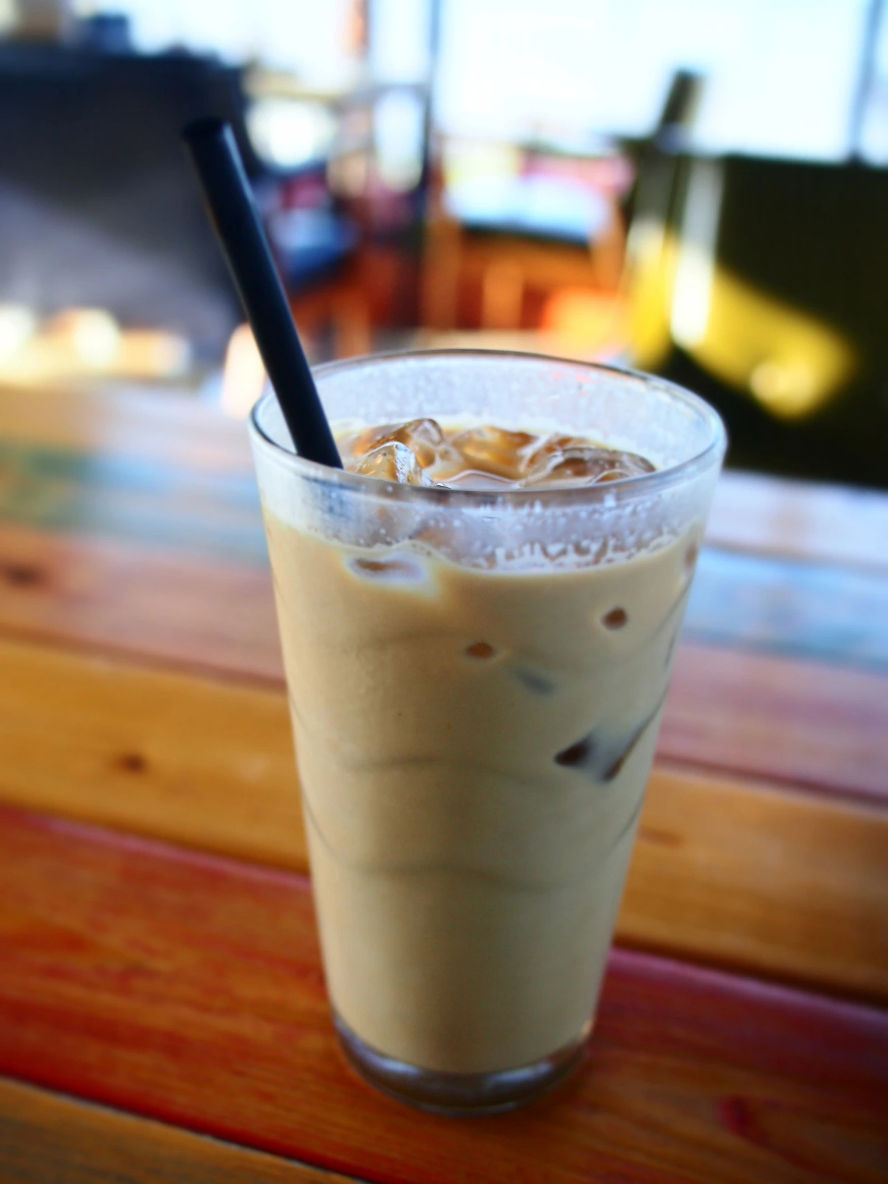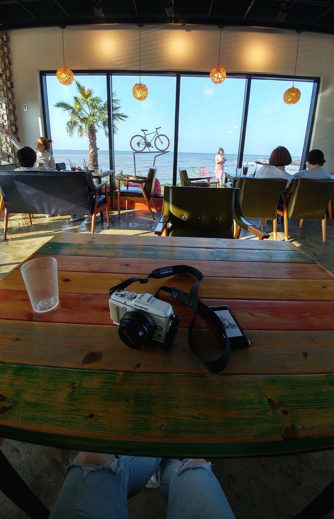 아이가 잠들었기 때문에 긴 소파형 좌석이 필요해서 카운터 옆에 자리를 잡고 아이를 뉘였다. 앞의 두 테이블 사이로 바다가 보여서 경관도 해치지 않는다. 깔끔한 아메리카노를 마실까 하다 느끼한 치킨 맛을 잡아보고자 달달한 연유라떼를 주문했다.