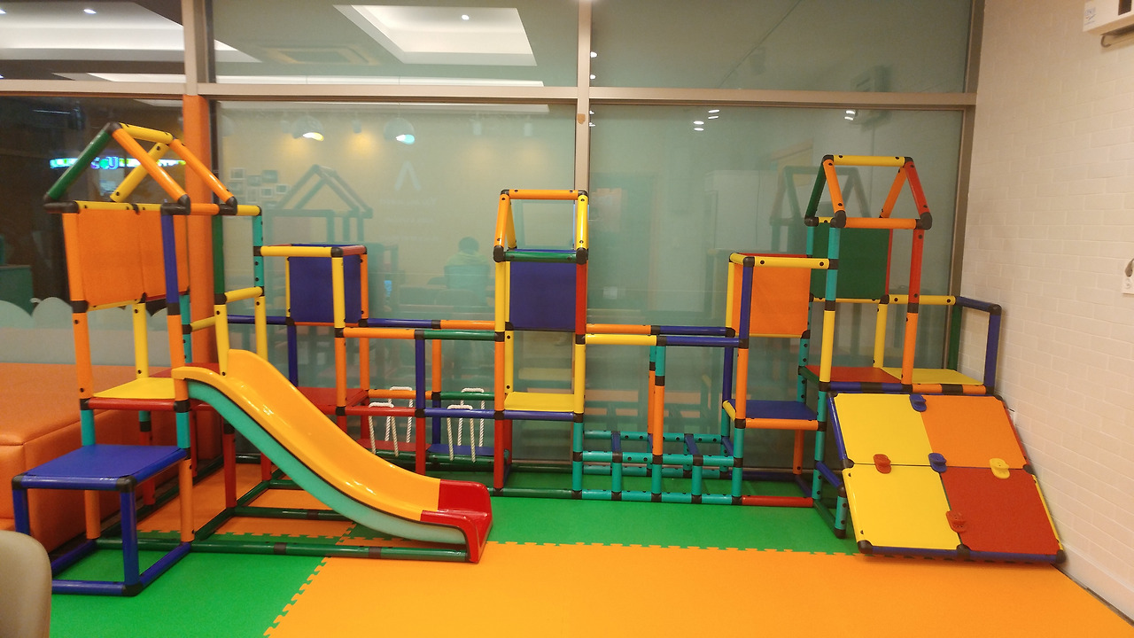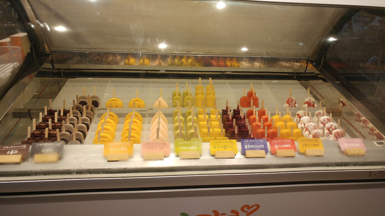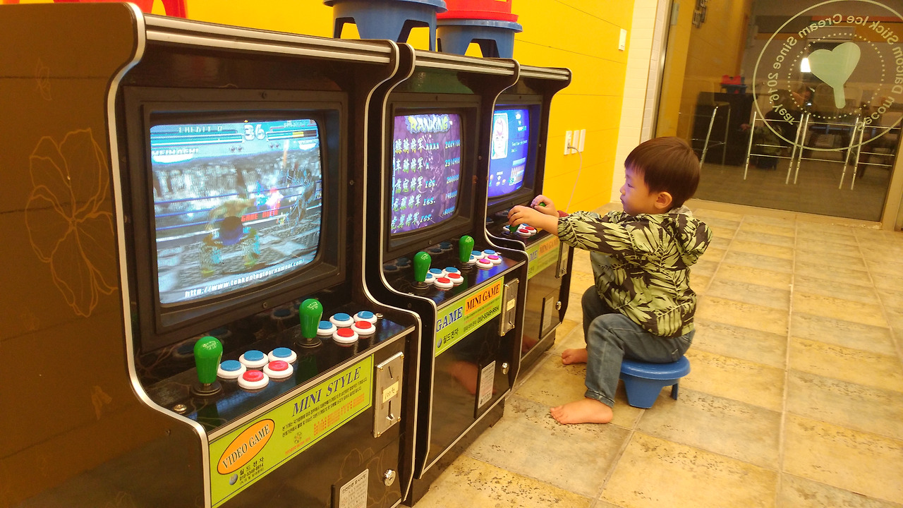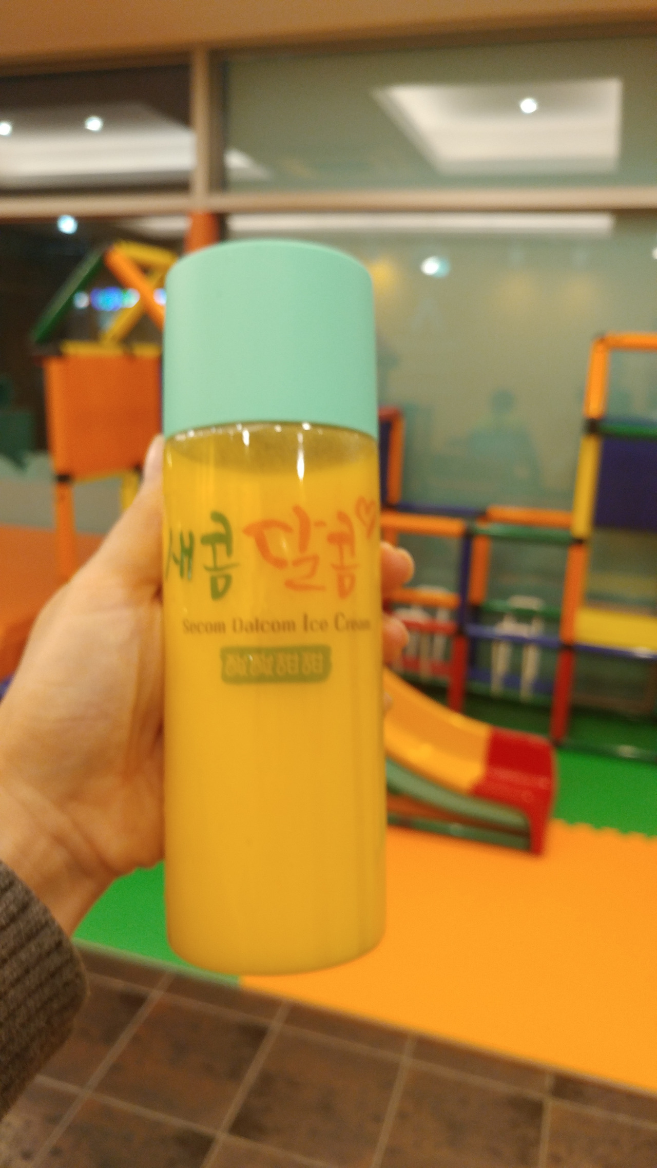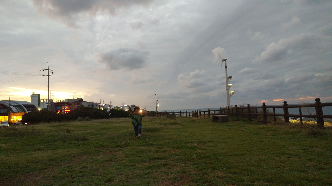 건너편 ‘새콤달콤’이라는 주황색 카페가 어둠 속에 눈에 띄었는데 겸이도 그걸 보더니 가보고 싶어 했다. 화장실도 오래 참은 터라 겸사겸사 길을 건너 찾아갔더니 한쪽에 아이들 놀 수 있는 놀이터와 오락기가 설치되어 있었다. 덕분에 겸이에게 ‘바닷가 놀이터에 간다’는 약속을 지킬 수 있었다.
