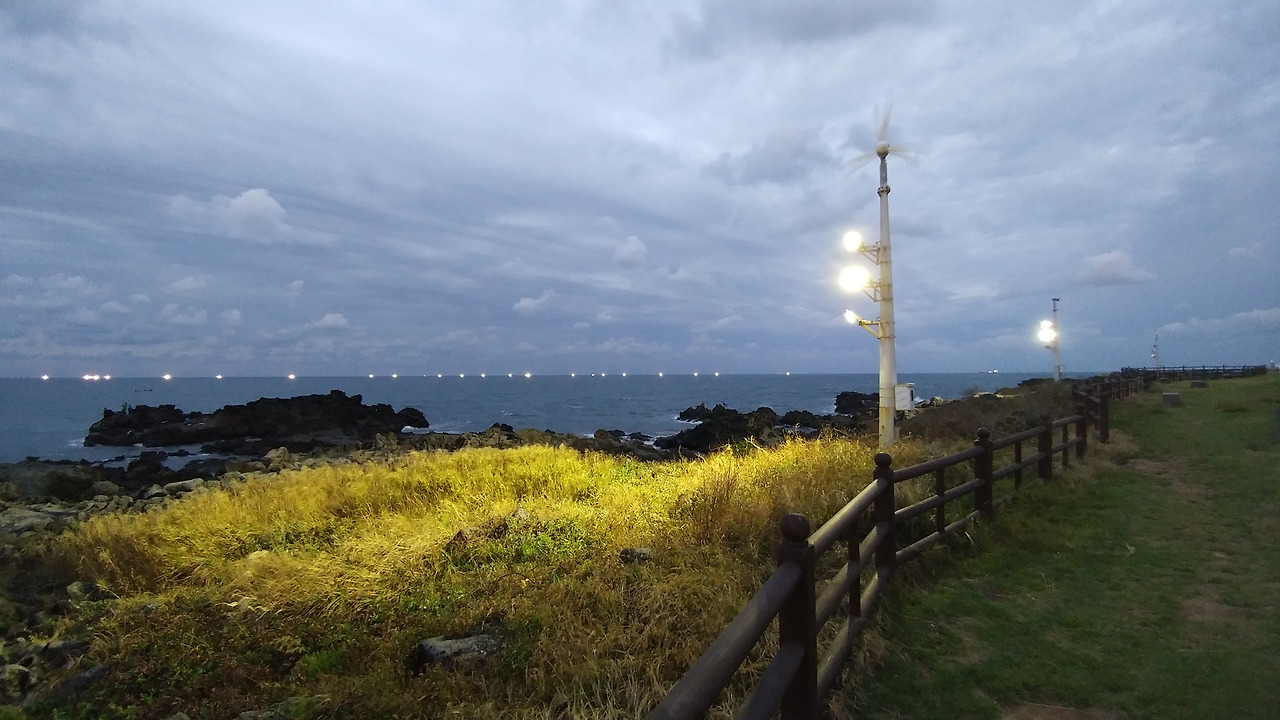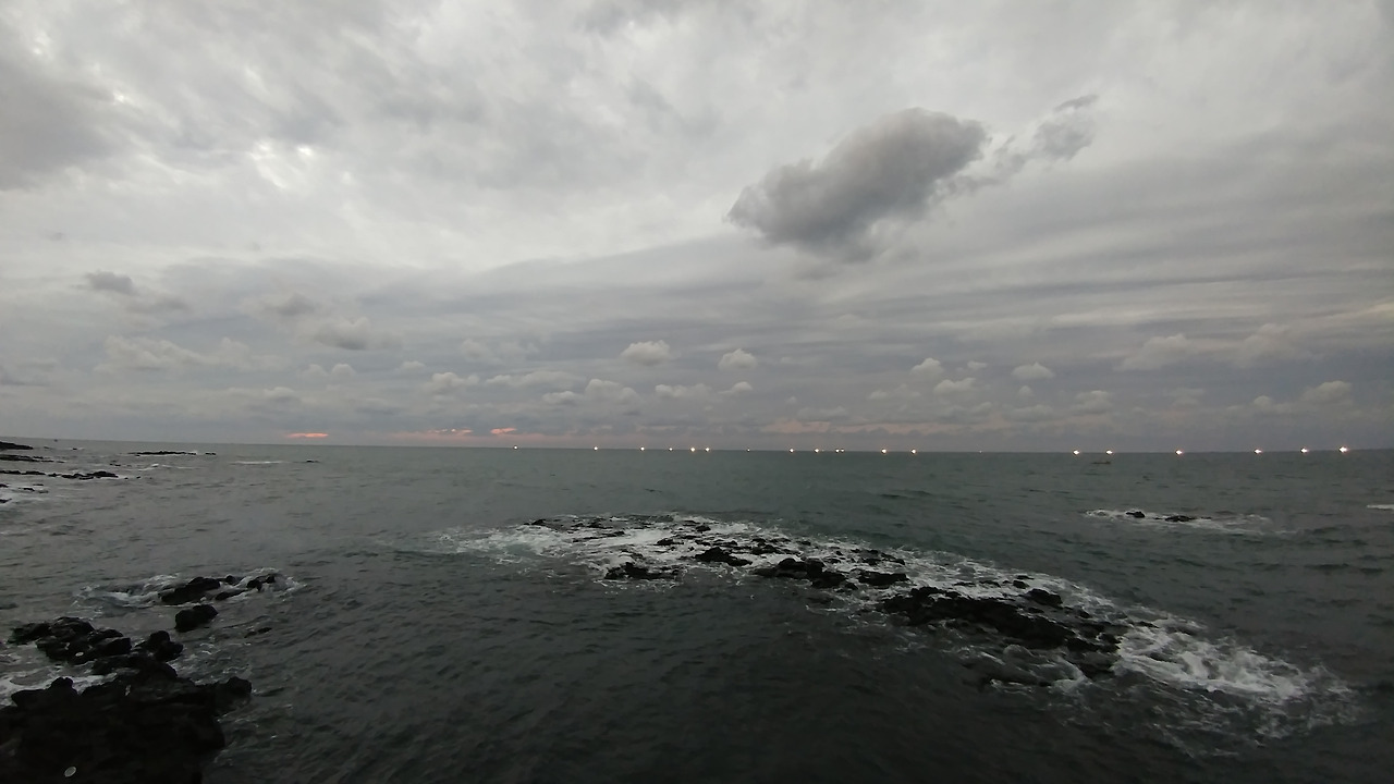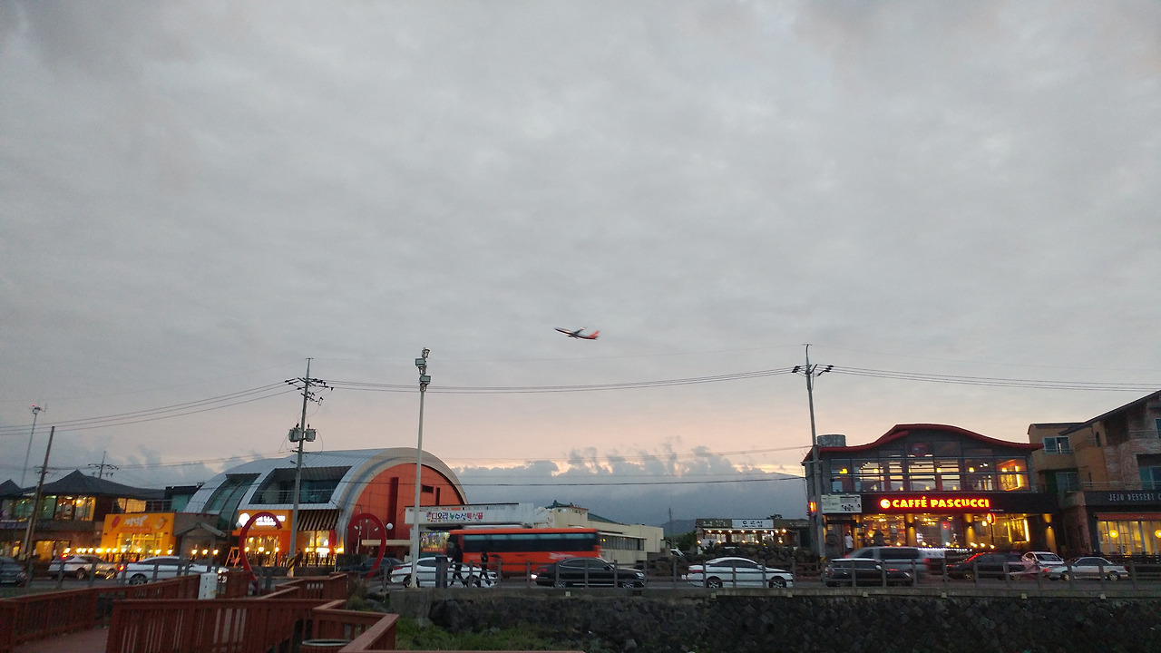 검은 바위로 부딪히는 파도와 일몰로 물든 빨간 하늘이 장관을 연출했다. 이호테우처럼 공항 근처의 제주바다는 주로 일몰이 예쁜가 보다 생각하며 놀이터를 찾는데 보이질 않았다. 이번에도 네비가 근처까지만 안내하고 종료해 버린 모양이다. 시간이 있었으면 다시 찾아볼 테지만, 우리에겐 30분 정도의 시간밖에 없기에 근처를 산책하면서 낚시하는 사람들도 구경하고 떨어지는 낙조를 보며 발길을 돌렸다.
