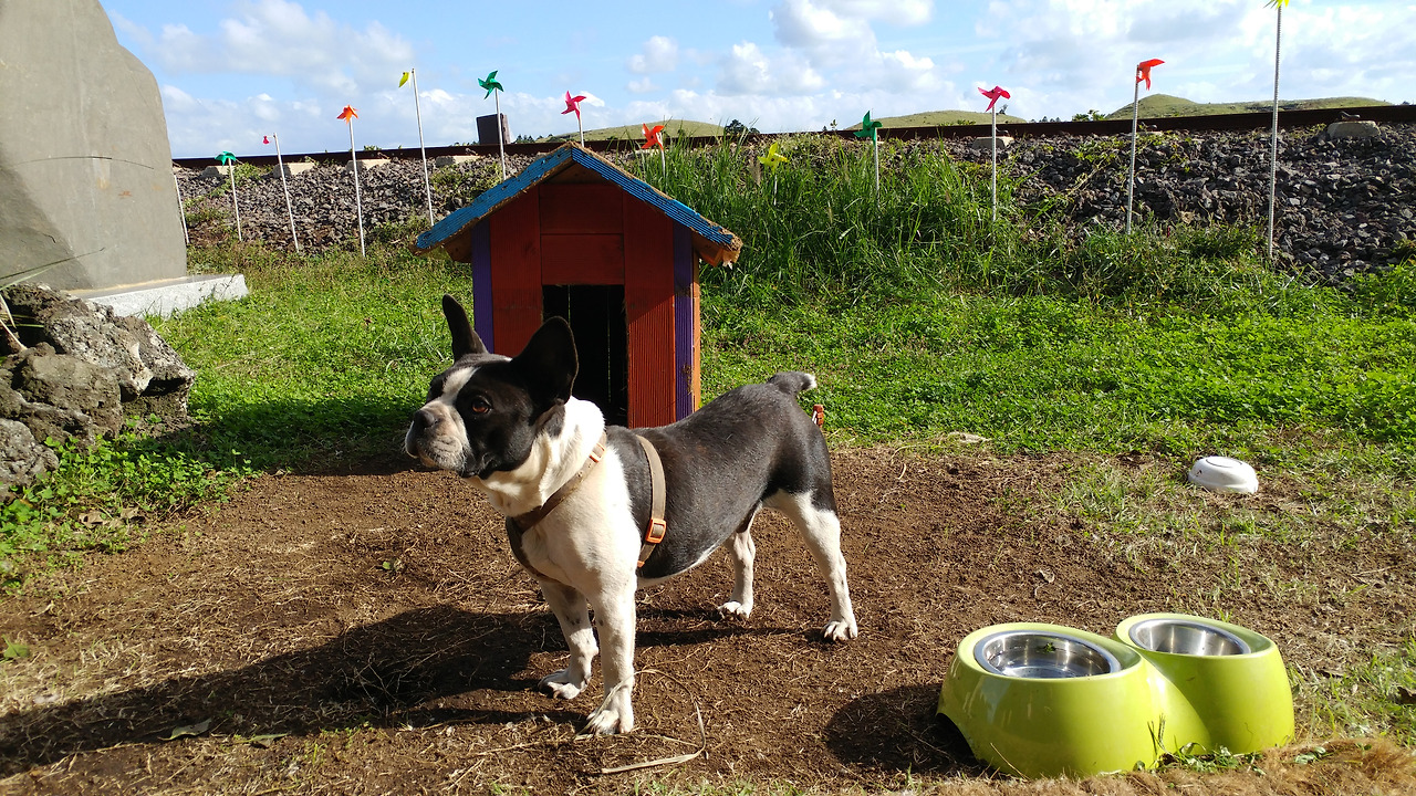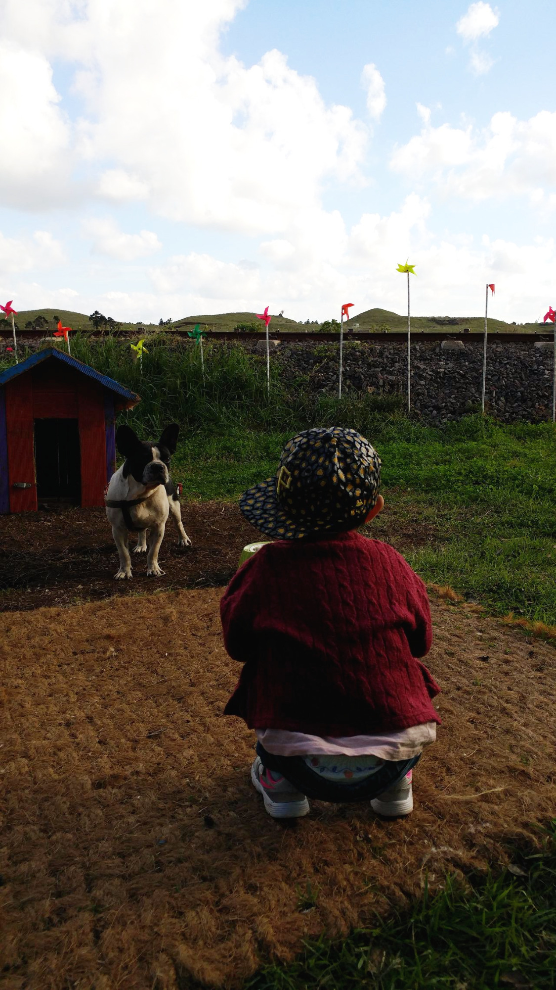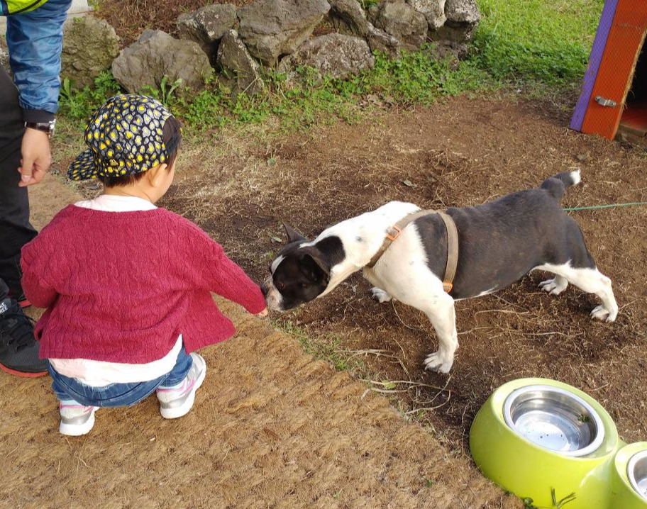 우리에게 깡깡 짖어대는 강아지 두 마리 옆에 있던 장난꾸러기 보스턴테리어 한 마리가 우리를 보고 다가왔다. 장난꾸러기라고 표현한 것은 앞서 바이크를 타고 들어올 때 자기 집 지붕에 올라 장난치고 있는 모습을 목격했기 때문이다. 하지만, 쉽게 다가갈 수 없는 단단한 외모에 우리는 처음엔 멀찍이 서서 구경했다. 그런데, 남편이 손등을 살짝 내밀자 경계심 없이 다가와 냄새를 맡고는 이내 살가워하는 것을 보고 외모와 다르게 순한 녀석이라는 생각을 했다. 아빠가 손을 내미니 아이도 겁내지 않고 자기 손을 가져다 댄다. 아무리 개를 좋아해도 처음엔 겁을 내기 마련인데, 서스름 없이 제 아빠를 따라 하는 모습을 보고 “정말 용감해졌구나!”라고 칭찬해 줄 수밖에 없었다.