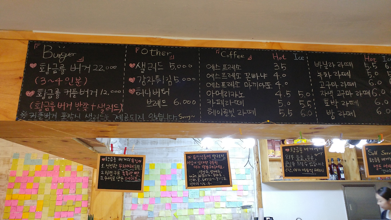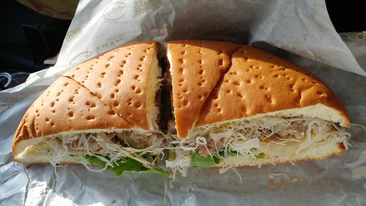 아침을 먹고 출발했지만, 점심 치고도 늦은 시간이다. 근처 식당을 찾아보니 ‘명진전복’과 ‘황금륭버거’가 나오는데, 우리는 전복요리가 당겼지만 씹어먹는 걸 좋아하지 않는 겸이는 안 먹을 것 같아서 버거 쪽을 선택했다. 출발할 때는 분명 10㎞이내였는데 막상 출발하니 20분이 넘게 걸리는 거리였다. 이럴 줄 알았으면 차라리 성산 쪽에 있는 맛집을 찾아갈 걸 그랬다며 투덜거리고 있을 즈음, 성읍의 황금륭버거집에 도착했다.