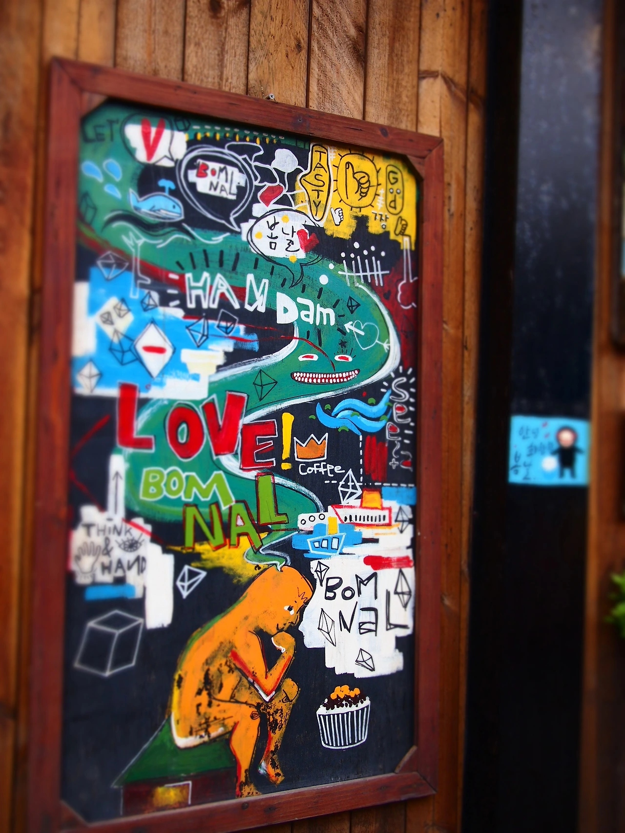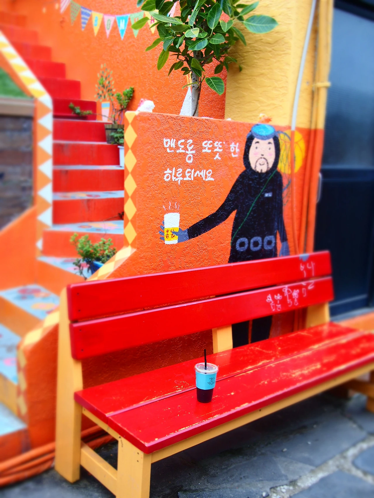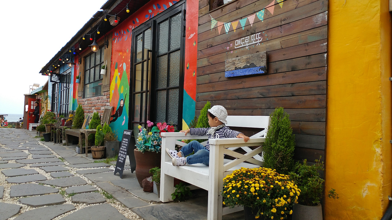 제법 멍멍이와 놀았는지 이제 바다를 보러가자는 나의 제안에 아이는 걸음을 옮긴다. 골목 곳곳에는 예쁜 그림들과 플래그, 화단 등 예쁘지 않은 것이 없고, 어울리지 않는 것이 없다. ‘멘도롱또똣’. 드라마의 제목으로 쓰이면서 그 뜻을 알게 된 말도 거기에 쓰여 있었다.(사실 그곳이 드라마 촬영지라는 것은 나중에 알게 되었다.)
