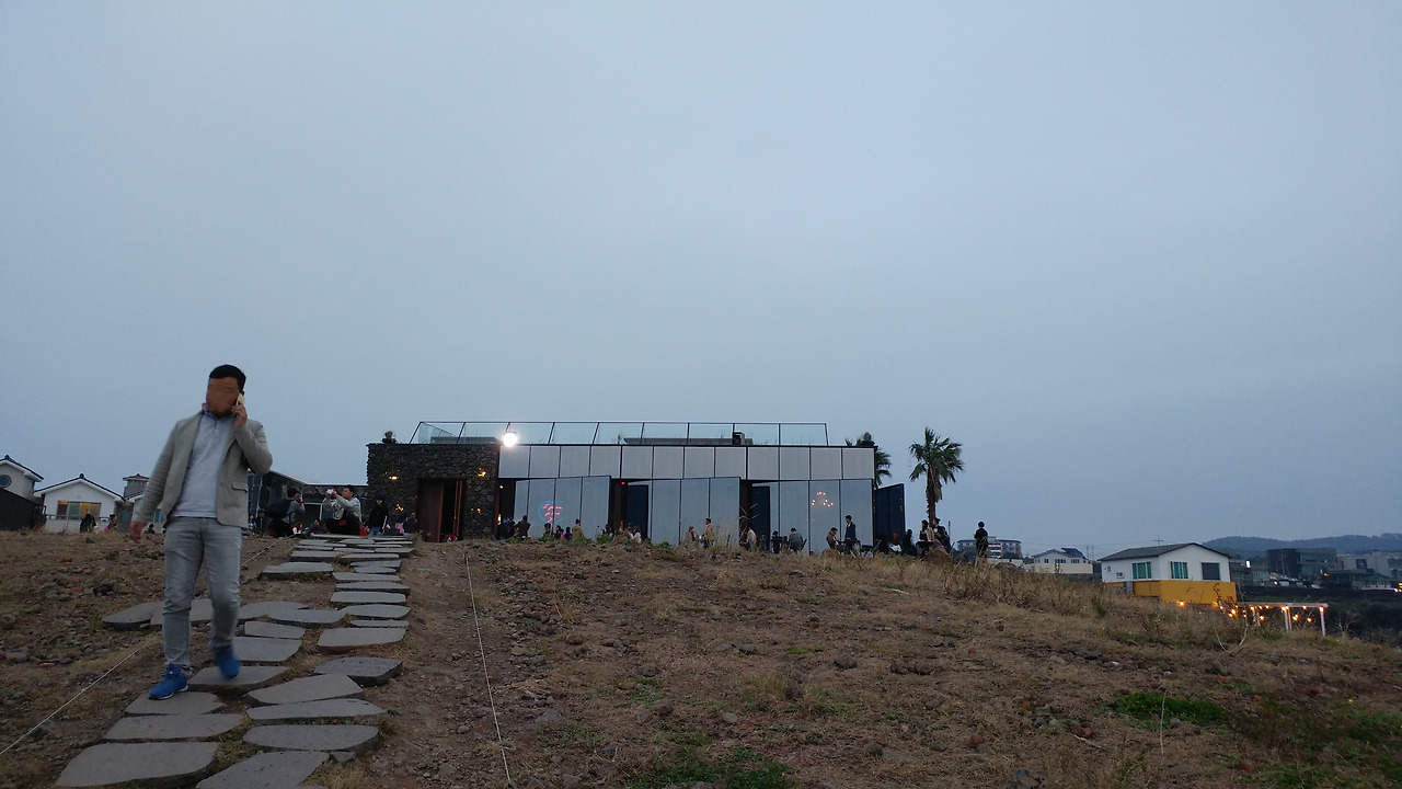카페 앞에는 자리를 잡기 위해 서성이고 있는 이들도 있고, 거울벽면에 비친 바다를 배경으로 웨딩촬영을 하는 이들도 있었다. 가기 전에 봄날카페에 대해 잠깐 살펴 본 바로는, '가급적 기존의 제주스러운 건축물에 손을 대지 않고 운영을 한다'는 쥔장의 글을 본 적이 있는데 왜 이렇게 모던한가 하는 생각이 들었다. 이 곳이 그 유명한 ‘봄날’인가 생각하며 코너를 도는데 한담해변의 까만 바위를 끼고있는 노랗고 코지해 보이는 집이 보였다.