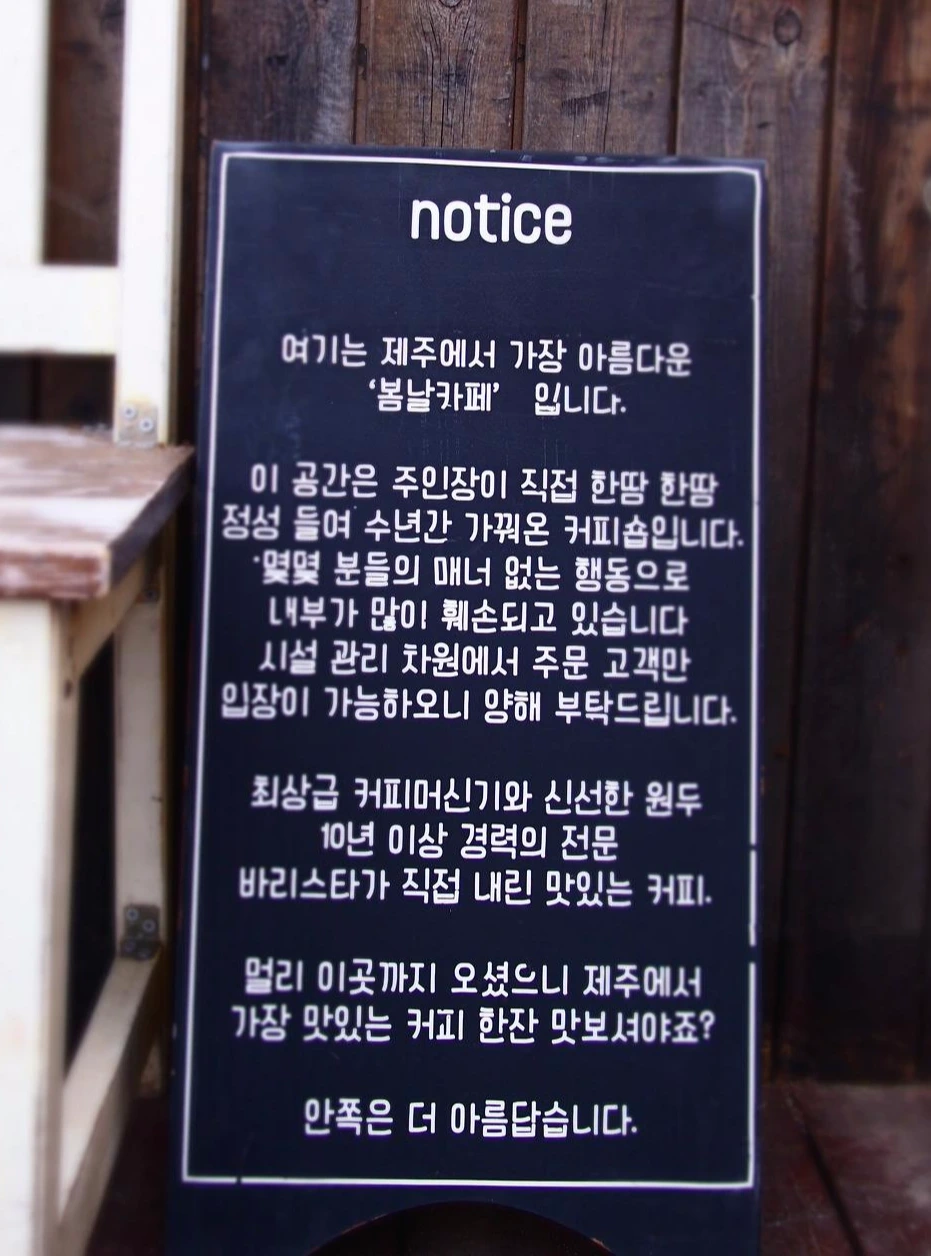 드나듦이 워낙 많은 카페라 입장하는 곳을 지키는 사람도 있었다. 돈을 내고 커피를 즐기시는 분들을 위한 배려라며 촬영만을 위하거나 잠시 화장실을 들르는 사람들을 제한하고 있다는 블로그 글을 보았을 때도, 또한 막상 그곳에서 그렇게 운영되는 것을 보았을 때도 솔직히 유명하다고 너무 야박하게 구는 거 아닌가 하는 생각을 했었다.