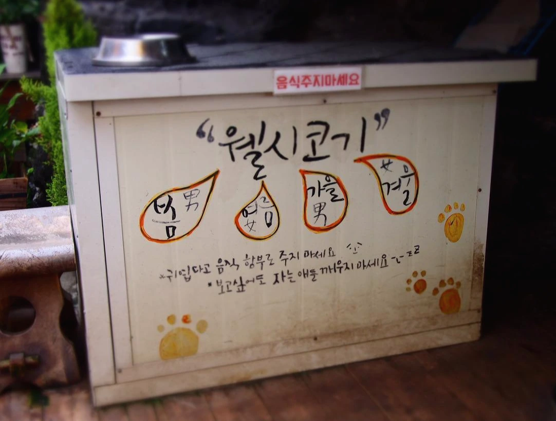 개들은 순했고 아이들의 손길이 좋은지 때로는 눈을 감고 졸린 표정을 지었다. 그런데 어떤 할머니뻘 아주머니가 나타나서는 “아휴, 개들이 얼마나 귀찮겠어. 얼마나 만져댔으면 저렇게 만져도 가만히 있겠어.”라고 혀를 끌끌 차며 개들을 쳐다본다. 개를 사랑하는 마음은 알겠다만, 나도 개를 가족으로 키웠던 사람 입장에서 개들은 사람들과의 스킨쉽을 좋아한다고 알고 있고, 우리집 까칠이개도 그랬다. 울타리 안에는 먹을 것을 주지 말 것과 잠 잘 때 깨우지 말아달라는 부탁이 담긴 팻말이 걸려 있는 것으로 보아 개들을 아끼는 주인의 마음을 읽을 수 있다. 그 개들이 모르는 사람들의 손길로 인해 스트레스를 받고 있다면 계속 그 곳에 놓아두었을 리 없다고 생각한다. 물론 그 아주머니 말이 맞을 수도 있지만, 어린 아이들이 좋아서 발을 동동거리며 만져주는 그 현장에서 무슨 심보로 저런 말을 하는 건지는 솔직히 아직도 이해가 가지 않는다.