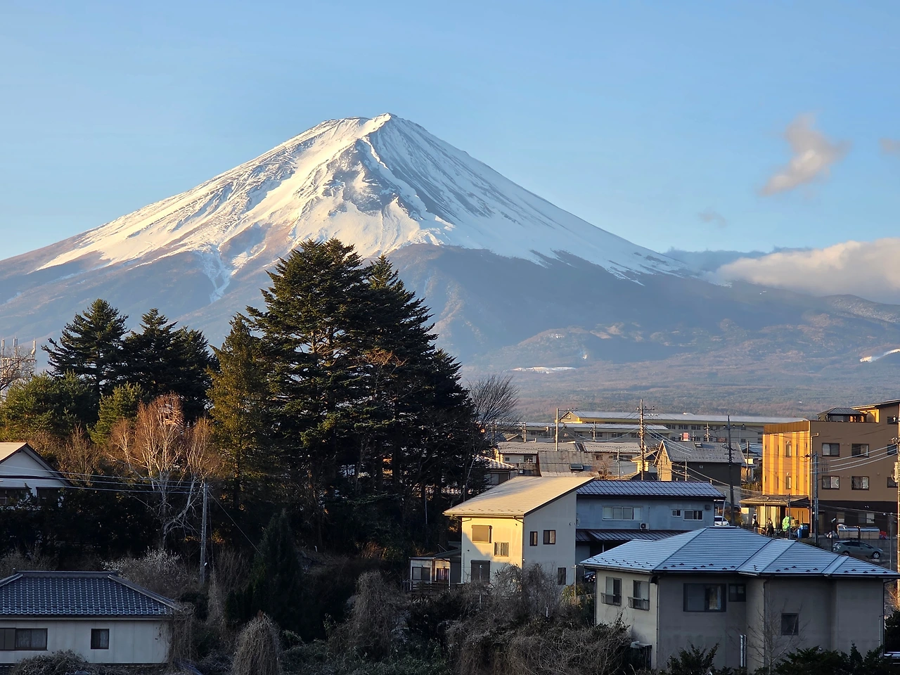 어제보다 더 또렷한 풍경이 창밖에 펼쳐져 있었다. 흰 눈을 덮은 후지산이 아침 햇빛을 받아 선명하게 서 있었다. 마치 오늘 여행의 주인공이 누구인지 분명히 말해주는 듯한 모습이다.