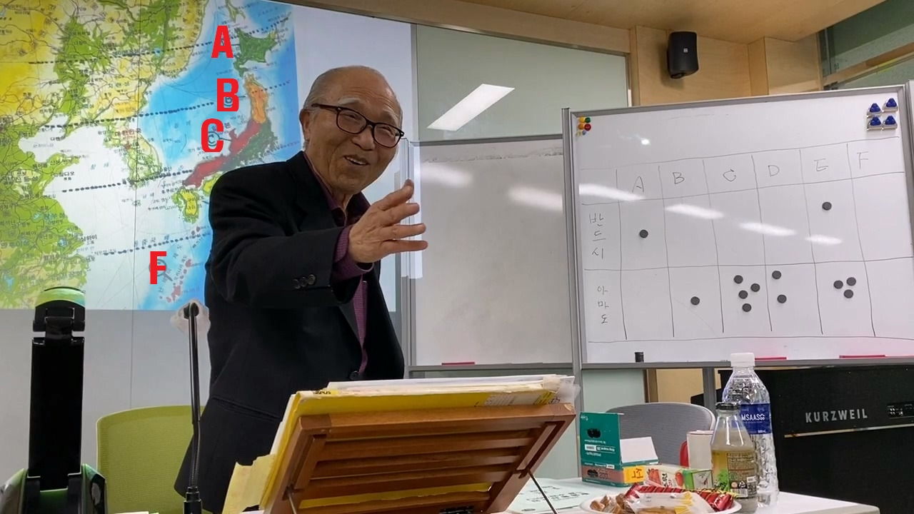참석한 선생님들은 노트에 자기 생각을 쓰고 옆 선생님과 의견을 나눴다. 이어 선생님께서 일본 지도를 화면에 띄웠다. 일본 지도는 위도 기준으로 A~F 여섯 구역이 선으로 그어져 있었고, 이 중 ‘낙농 1번지’가 어디인지 써보라고 했다. 선생님들 각자의 생각이 마련되자 화이트보드의 ‘반드시’와 ‘아마도’ 구역에 동전 자석을 붙이게 했다. 이유를 설명할 수 있으면 ‘반드시’, 확신은 없지만 그럴 것 같으면 ‘아마도’에 붙이라고 했다. 대부분 C~E와 같은 위도가 낮고 따뜻한 지역에 자석을 붙였다.