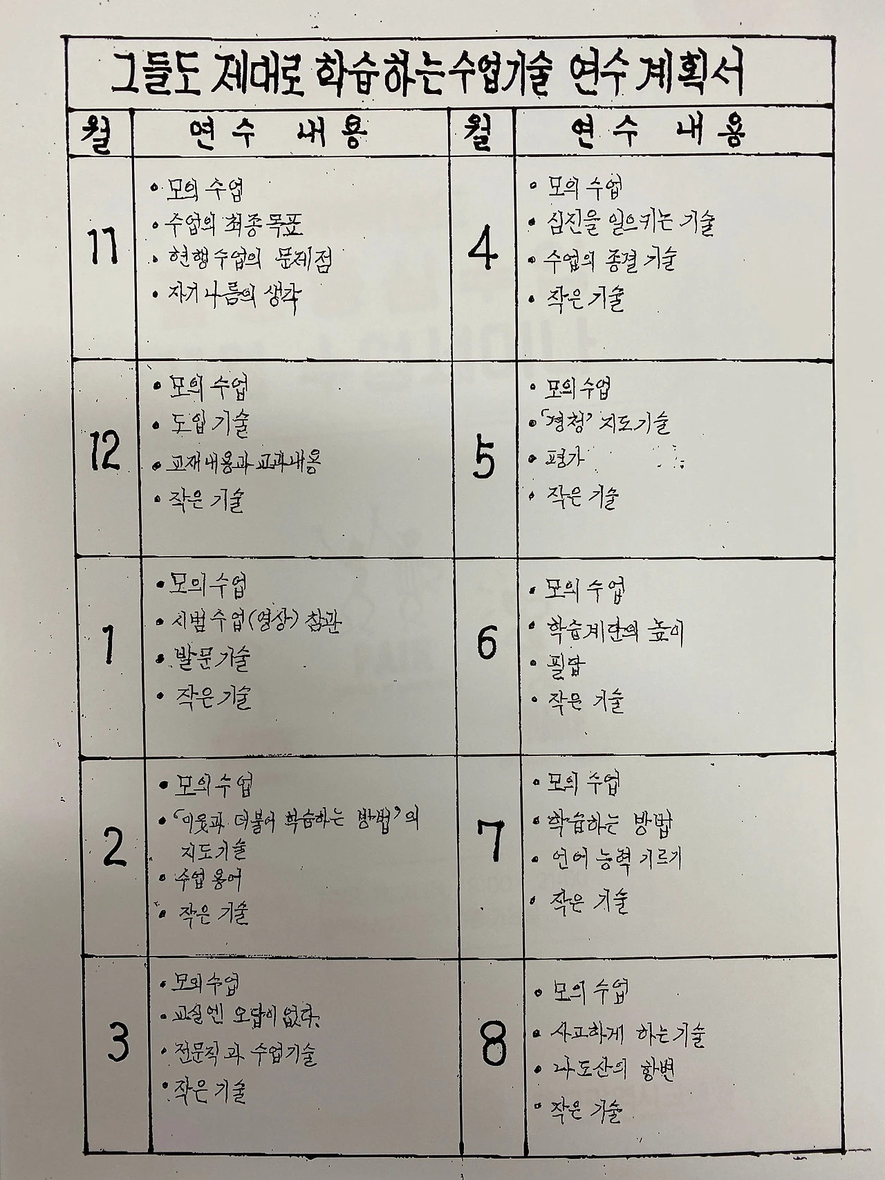 특강을 마치고 감사 인사를 드리자, 오히려 초청해 줘서 고맙다고 하시며 “수업기술은 한 번의 연수로는 자기 것이 되기 어렵다”라고 말씀하셨다. 그 말씀이 반가워 “선생님만 허락해 주신다면 언제든 강의 일정을 잡겠다”라고 답했다. 늦은 시간 다시 터미널까지 모셔다 드리고 선생님과 헤어졌다. 그리고 며칠 뒤 집으로 ‘연수 계획서’가 우편으로 도착했다. 총 10회 연수였다. 이후 교육청과 협의해 한 번에 4시간씩, 총 여덟 차례의 연수를 진행했다.