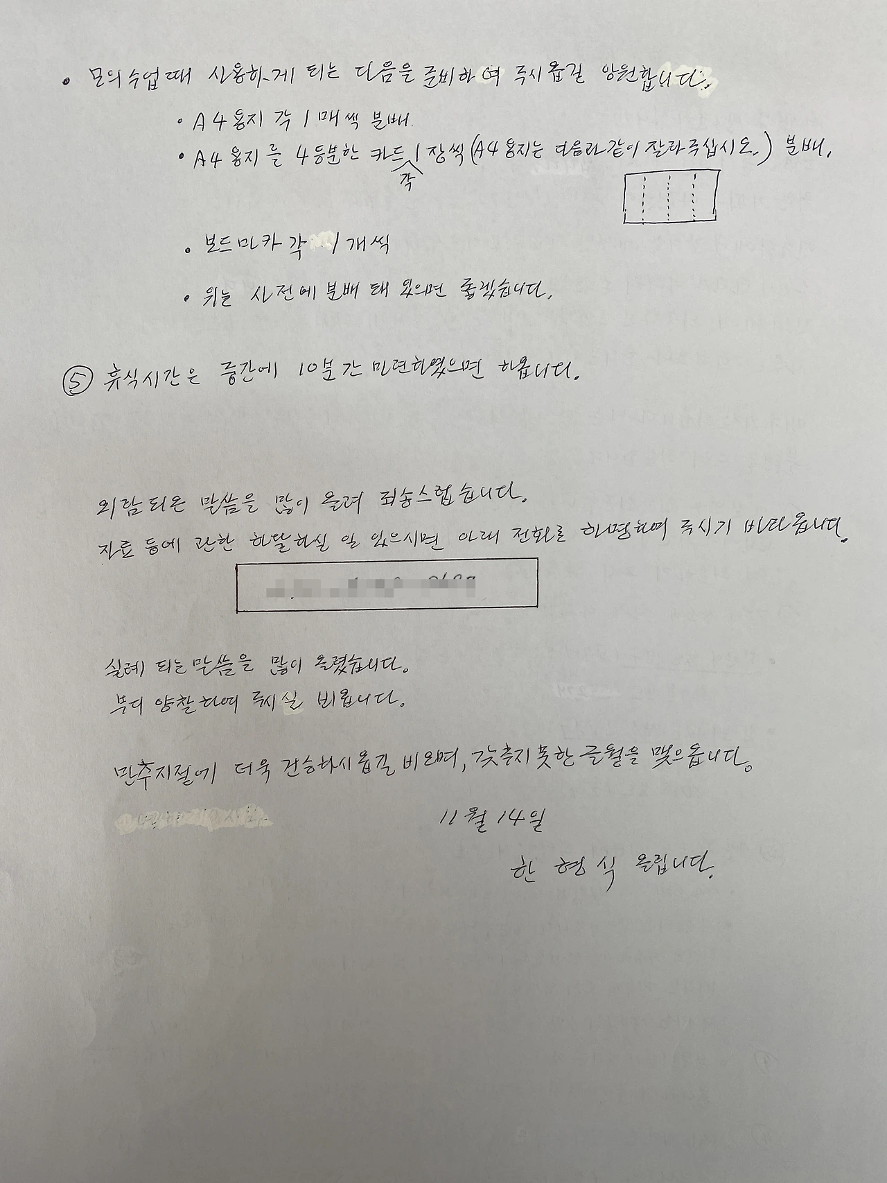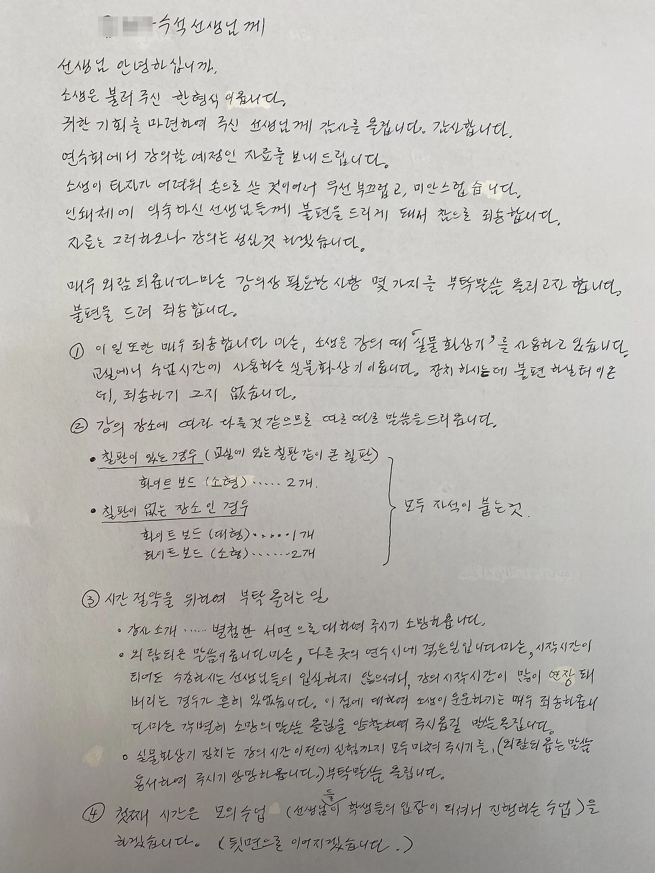 특강에는 40명 넘는 선생님들이 신청하셨다. 모두 기대가 컸다. ‘선생님께서 어떤 말씀을 하실까?’ 선생님은 곧바로 강의 준비에 들어가셨다. 직접 손글씨로 만든 강의 자료를 순서대로 배치하고, 미리 요청하셨던 강의 도구를 꼼꼼히 점검하셨다. 강의가 시작되자 선생님은 참석한 교사들을 대상으로 모의 수업을 진행하셨다. 우리가 학생이 되어 한 차시 수업을 그대로 경험하는 방식이었다.
