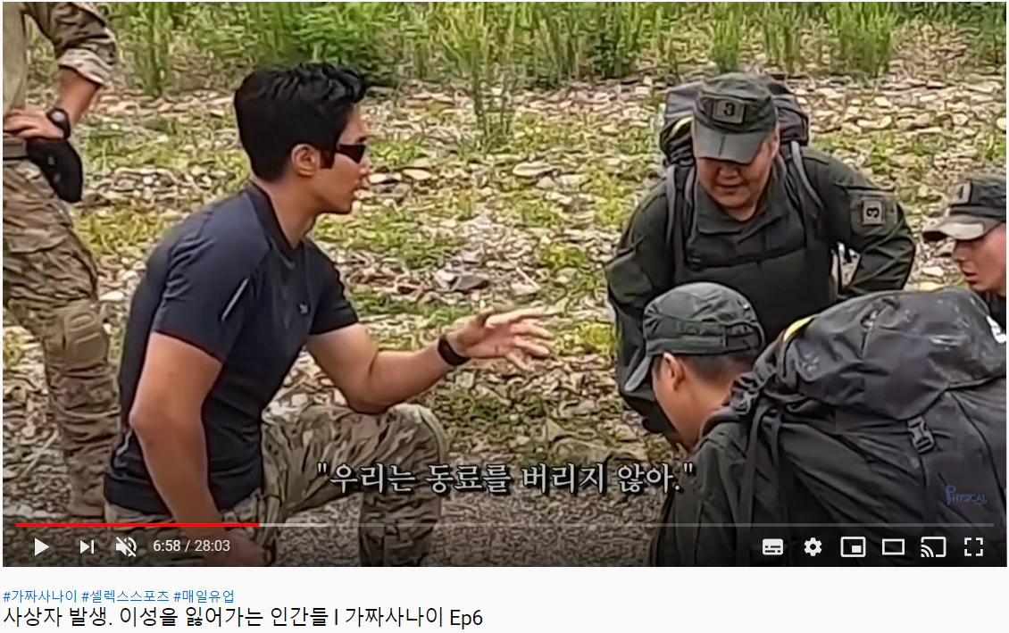 "Self-aid(자가치료) 했지. 근데 계속 싸워야 돼. 우리 팀에 예를 들어 8명이다. 한 명이 계속 이렇게 누워 있으면. 한 명이 그러면 몇 프로가 팀에서 손상된 거예요. 다시 총기 잡고 싸워 줘야 돼. 그게 팀워크입니다."