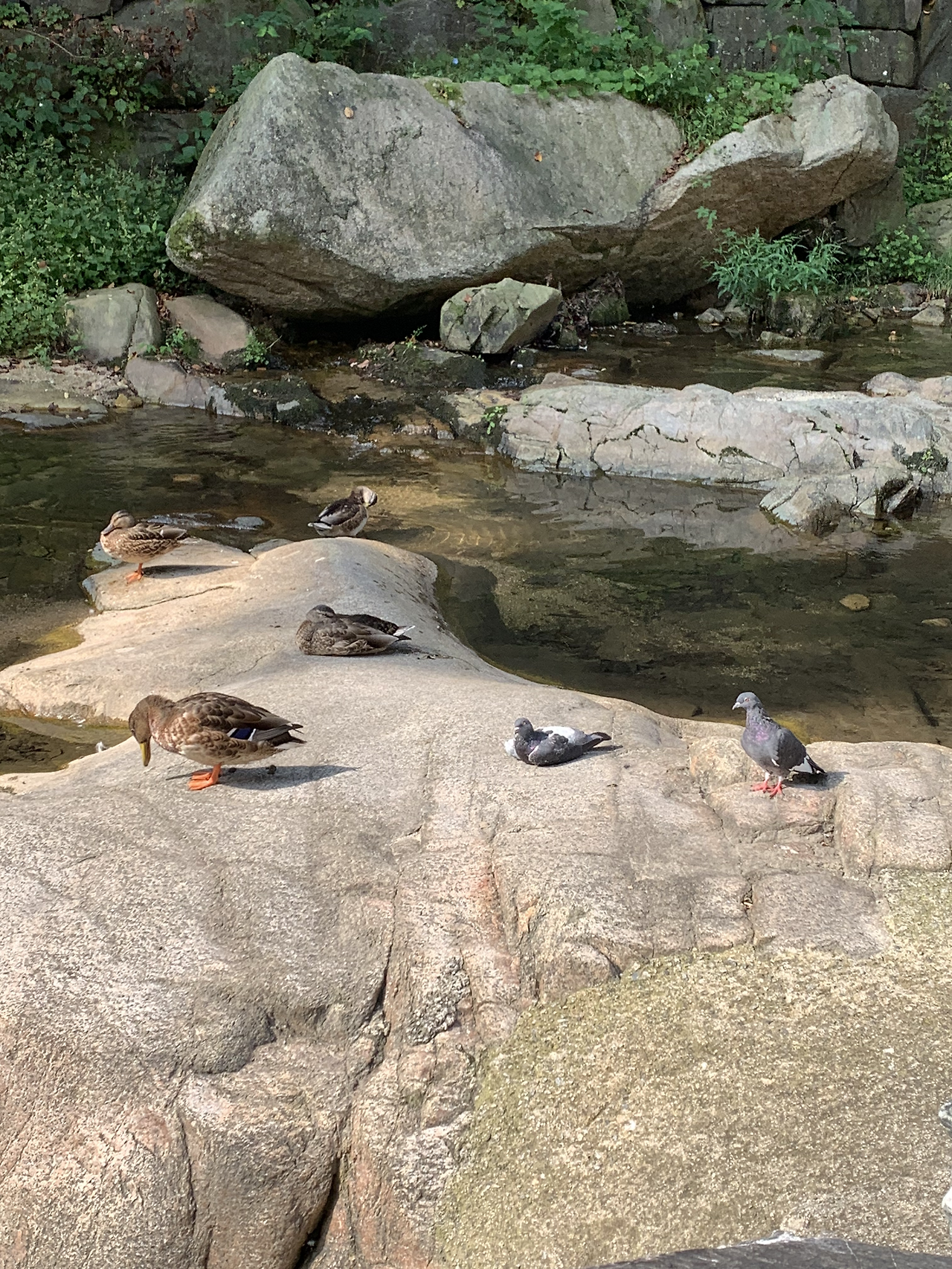오리도 비둘기도 이렇게 사이좋게 햇볕 쬐는데.