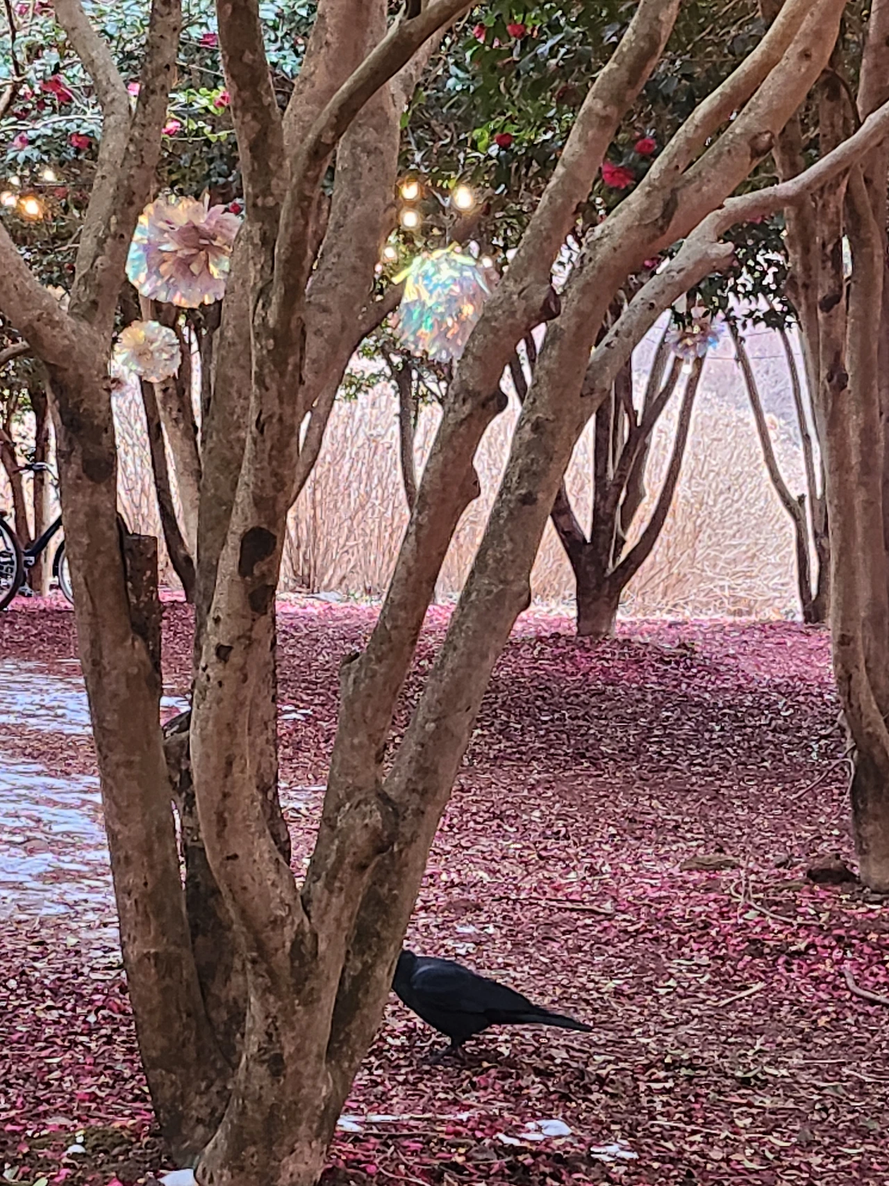 아름드리나무 아래 붉은 튤립과