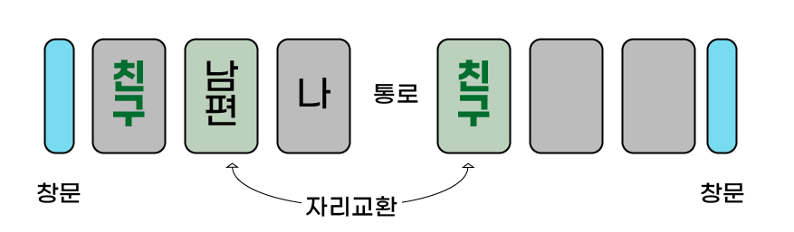 티켓 좌석을 확인해 보니 통로를 사이에 두고 떨어진 자리였다. 옆에 앉은 파키스탄 사람에게 자리를 바꿔줄 수 있는지 조심스레 양해를 구했고 아주 흔쾌히 바꾸어주었다. 그런데 알고보니 우리가 이 친구 사이를 갈라놓은 것이었다! 대략 아래와 같은 민망한 배치가 완성됐다. ‘아니, 이런 상황에서 어떻게 고민하는 내색 한 번 없이 자리를 내어줬지?‘