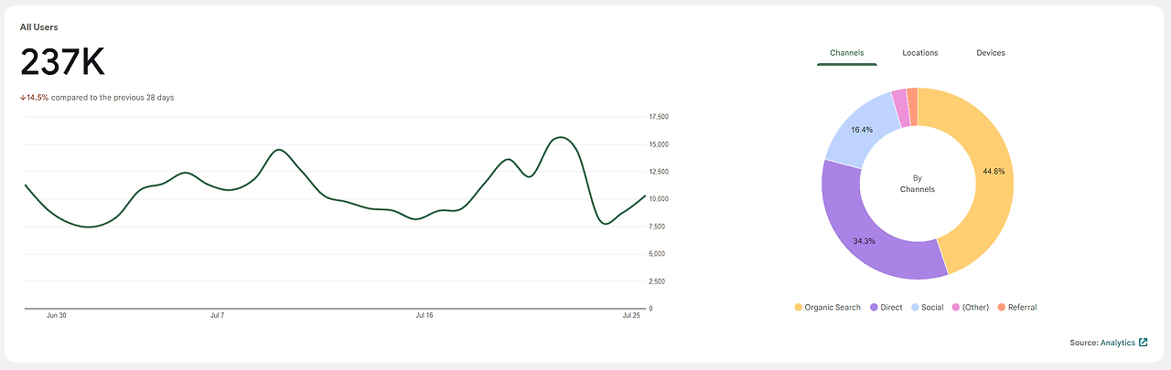 트래픽을 발생 시키는 방법으로는 다양한 방법이 존재 합니다. 아래는 제가 운영하는 사이트의 트래픽 분포인데 사람들이 어떻게 방문하는지의 비율을 보여줍니다.