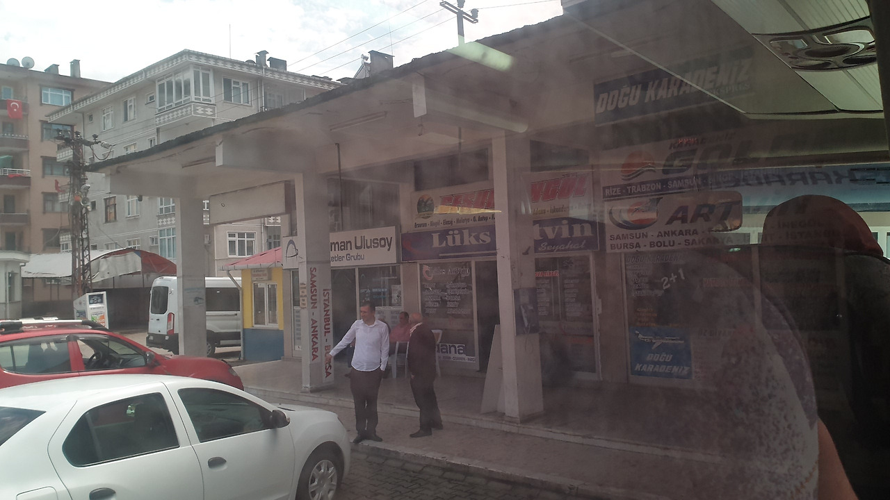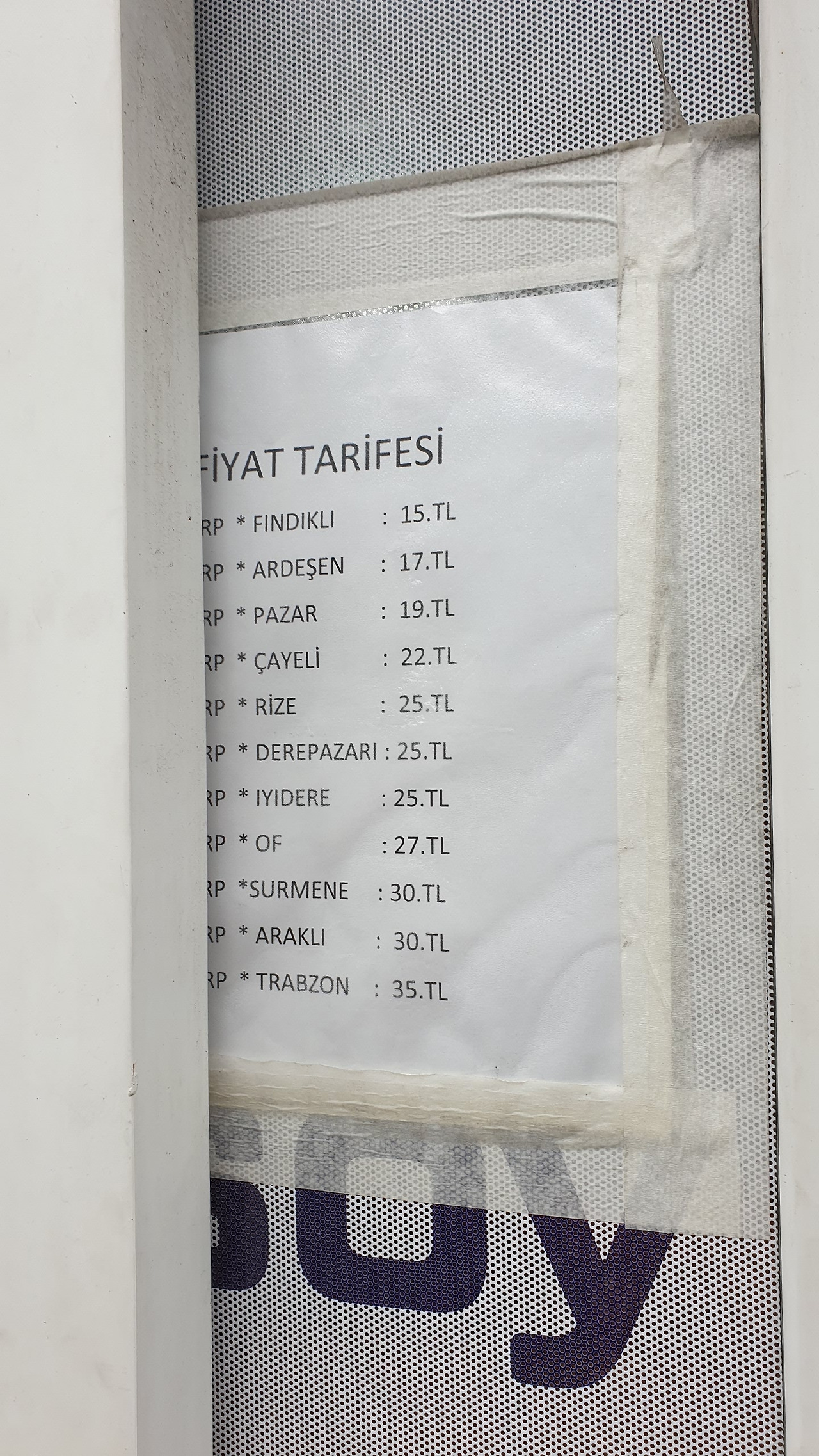 멀리 보이던 모스크가 가까워졌고 드디어 터키 땅에 들어왔다. 진짜 신기한 게 선 하나 건너왔는데, 완전 적극적인 호객이 시작된다. 택시 기사들이 어디 가냐고 제일 일선에서 물어본다. 사실 나중에 이들이 필요할 수도 있기 때문에 정중히 웃으며 걸어갈 거라고 너스레를 떨면서 빠져나왔다. 어딜 가는지도 모르고 앞으로 걷는데, 한 아저씨가 따라붙더니 버스에 데려다준다고 했다. 믿기 어렵지만 비도 오고 어쩔 수 없이 따라가며 있는 봉고와 미니밴들을 유심히 지켜보며 여차하면 중간에 얻어 탈 수 있는 지를 가늠하고 있었다. 얼마냐고 물으니 리제는 25 터키 리라라고 했는데 일단 밑도 끝도 없이 비싸다고 손사래를 쳤더니 아니 라고아니라고 하면서 어딘가로 데려갔고 진짜 큰 버스들이 있었고 티켓 판매처도 있었다. 정가가 쓰여있었는데 리제는 25리라가 맞았다.