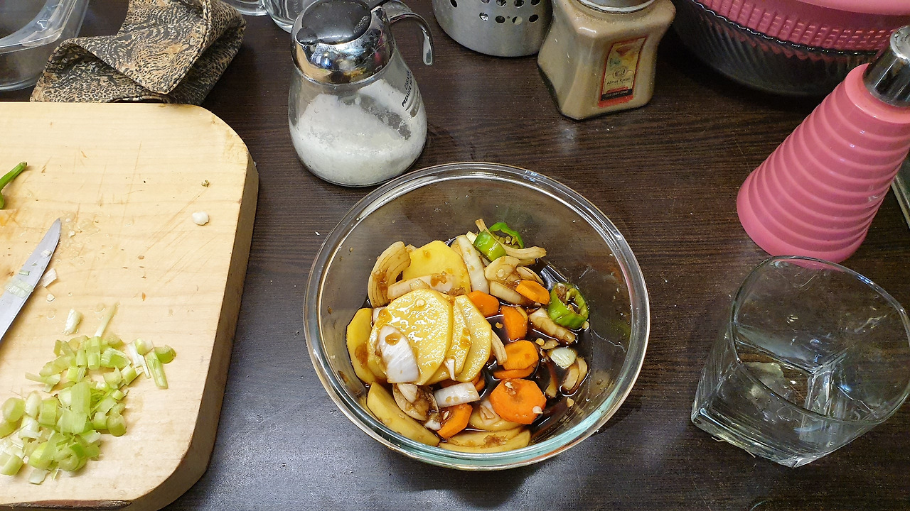 집으로 와서 우유에 닭을 재워놓고 비린내를 제거 후 우유를 씻어내고 대파 마늘 양파 등을 넣고 물에 한번 삶았다. 그 사이 간장 양념을 만들고 한번 삶은 닭을 물을 제거한 후 양념과 함께 졸인다.