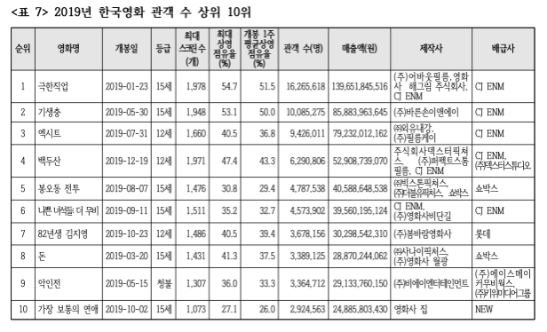 다음 표는 2019년 한국영화 관객 수 상위 10위까지의 작품들이다. 이 작품들의 개봉시기를 참고하면 계절별 흥행 영화를 분석해 볼 수 있다.