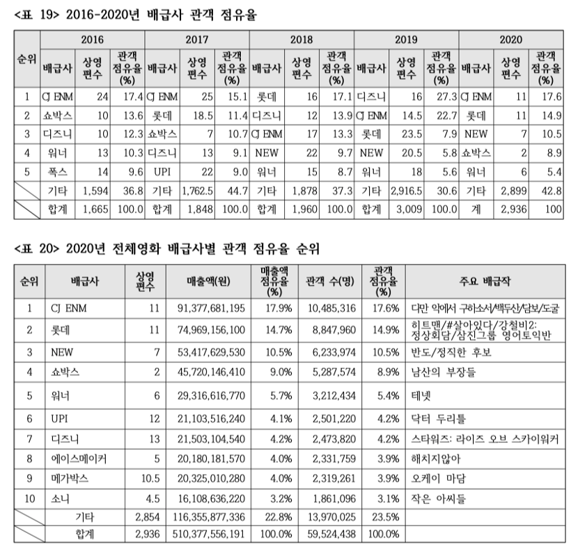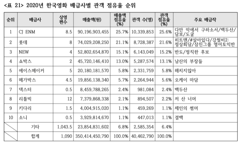 <한국영화산업통계>의 "연간 상영 편수"와 "전체 관객점유율"을 한번 살펴보자. 2020년 한국영화 배급사 순위를 보면 1위 CJ E&M은 한국영화 11편을 배급, 전체 관객점유율 17.6%를 차지했고 2위는 롯데가 11편 14.9%, 3위는 NEW로 7편, 10.5%, 4위 Showbox는 2편 8.9%, 5위 워너 브라더스는 6편 5.4%의 전체 관객점유율을 차지했다.[7] 2020년 한해 동안 상영된 영화가 총 2,936편이었는데 상위 5대 메이저 배급사가 고작 1,26%인 37편의 영화로 57.2%의 관객을 확보하며 전체 시장의 60% 가까이를 점유했다. 이중 쇼박스의 경우는 <남산의 부장들> 외 단 한편으로 8.9%라는 높은 점유율을 보였다. 10위까지의 배급사로 확대하면 약 3%의 영화(82편)가 75.6%, 무려 전체 시장의 3/4를 장악하고 있다. 결국 남은 2,854편의 영화가 23.5%의 시장을 나눠가졌다는 것이고 개봉 영화의 97.2%는 여기에 속한다.