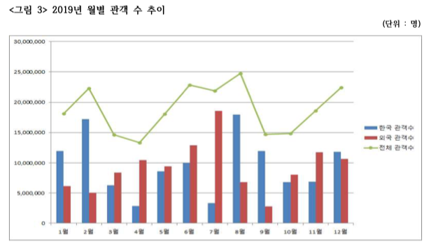 먼저 잠재 시장의 규모는 <한국영화산업통계>의 "월별 흥행 추이", "개봉 시기별 관객 분포"를 살펴보면 확인할 수 있다. 2020년은 코로나 팬더믹으로 인해 극장 관객이 급감하였고 정확한 월별 흥행 추이를 분석하는데 한계가 있기에 2019년 월별 관객 수를 살펴보고자 한다.