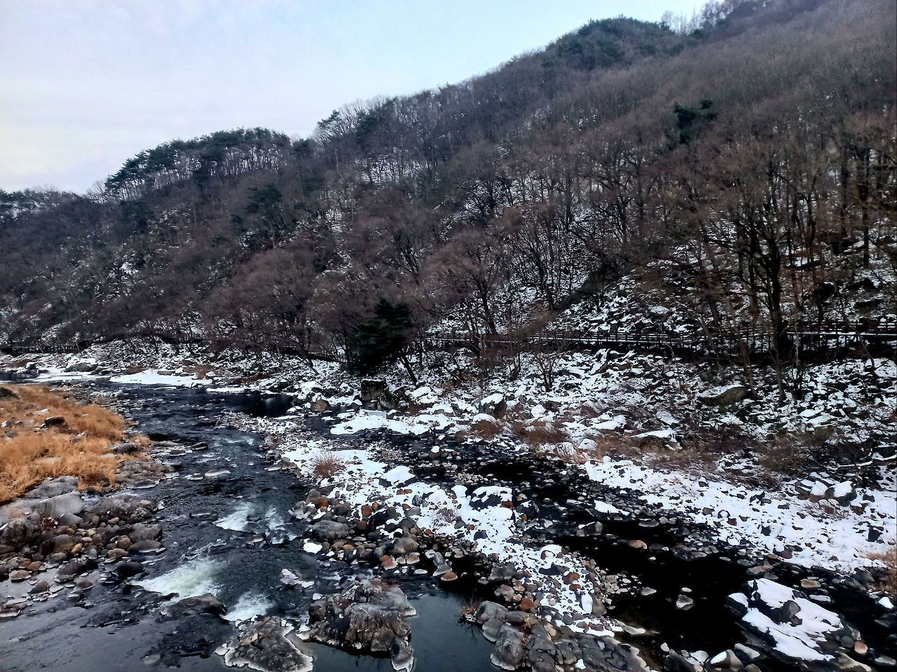 다리를 건너면 산기슭을 따라 조성된 자락길을 걸을 수 있다. 물줄기 하나 건넜을 뿐인데 산그늘 안으로 들어서면 분위기가 완전히 달라진다. 방부목으로 잘 조성된 산책길. 역광에 세세하게 빈 가지들을 드러낸 겨울숲이 섬세하고 사색적인 단색의 풍경을 그려내고 있다.