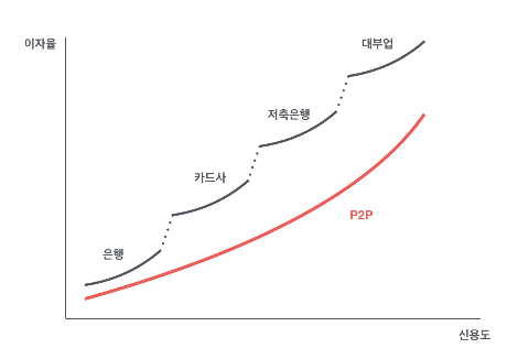 현재 대출 시장은 대출자의 신용도에 따라서 각각의 금융기관이 나누어서비스를 제공하고 있는 형태다. 거대한 대출 시장을 계단형 그래프처럼 나누어 서비스를 제공하고 있기때문에 각 업권의 경계선에 있는 사람들은 아주 미세한 차이로 인하여 금리의 계단효과를 경험한다.계단처럼 벽이 형성되어 있는 각각의 시장속에서 우리가 인지하지 못한 사이에, 비대해진 금융기관의 여러가지 요소들에 의하여 왜곡된 결과물들을 대출자들은 당연하게 생각해왔다.