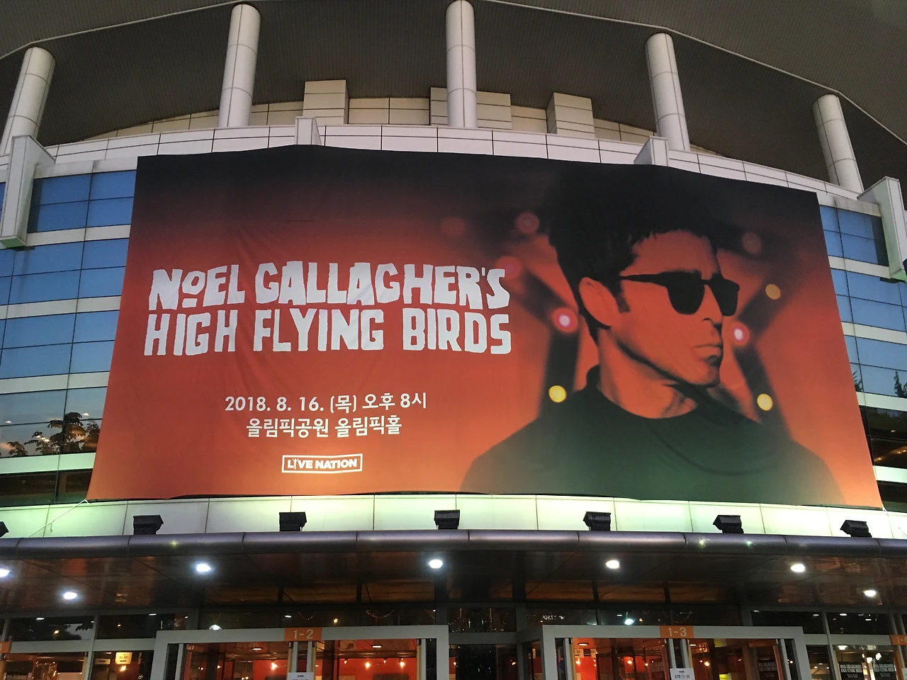 올림픽공원을 돌아 공연장에 들어서자, 공연장 특유의 따스하고 습한 공기가 나를 맞이했다. 갑자기 확 설레었다. '정말 죽기 전에 노엘 갤러거를 보는구나.' 자꾸만 생각하게 되었다. 무대 옆 전광판에는 "NOEL GALLAGHER'S HIGH FLYING BIRDS"라는 글씨가 검은 스크린 위에 써져있었고, 하이 플라잉 버즈스러운 음악이 공연장을 가득 메우고 있었다. 쩌렁쩌렁한 하이 플라잉 버즈의 음악을 듣고 있자니 약간의 아이러니함이 머리를 스쳤다. Supersonic, Wonderwall, Don't look back in anger 부르는 것을 듣기 위해 잘 알지도 못하는 노래들을 들어야 하는구나, 생각했다. 하이 플라잉 버즈의 1집과 2집은 그럭저럭 챙겨 들었기 때문에 들으면 무슨 곡인지 알텐데, 3집은 별로지 싶어서 아예 듣지도 않았기 때문에 잘 알지도 못했다. 모르는 노래인 걸 보니, 지금 공연장을 메우고 있는 노래는 3집이겠거니 했다. 스탠딩 좌석을 메운 관객들은 노엘 갤러거의 팬일까 오아시스의 팬일까, 문득 궁금해졌다. 적어도 좌석보다는 노엘 갤러거의 팬일 확률이 높겠지, 공연 내내 몸을 흔들고 호응을 할 자신이 있다는 뜻일 테니까, 이런저런 생각들이 머릿속을 맴도는 동안, 시간도 같이 흘러갔고, 마침내 노엘 갤러거가 무대 위에 나타났다.