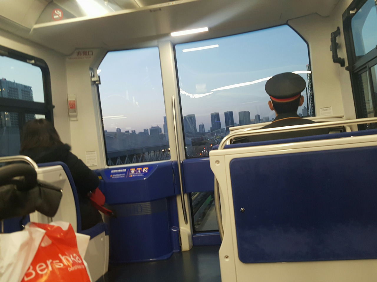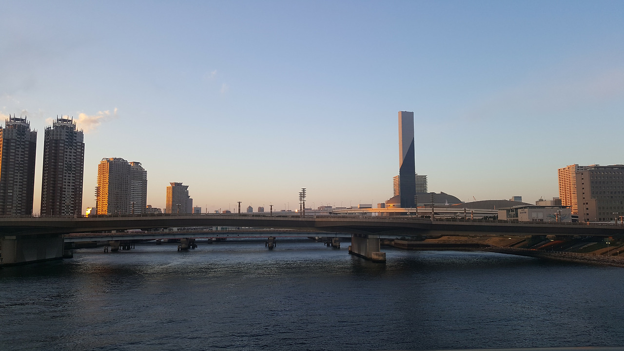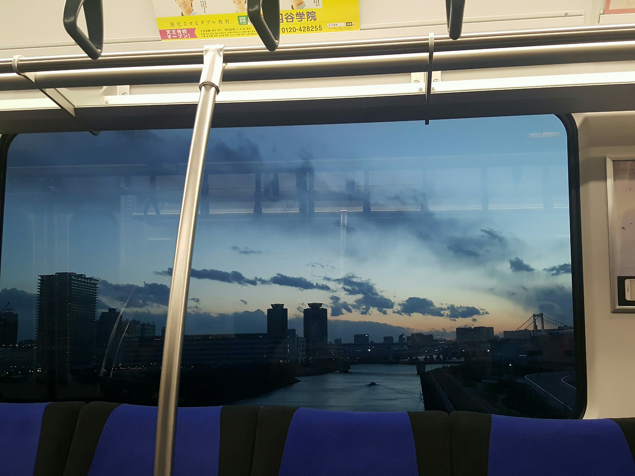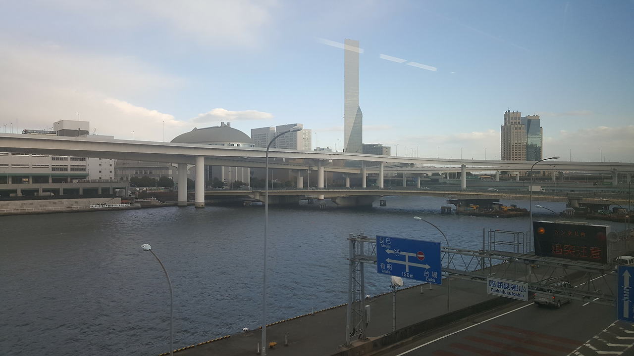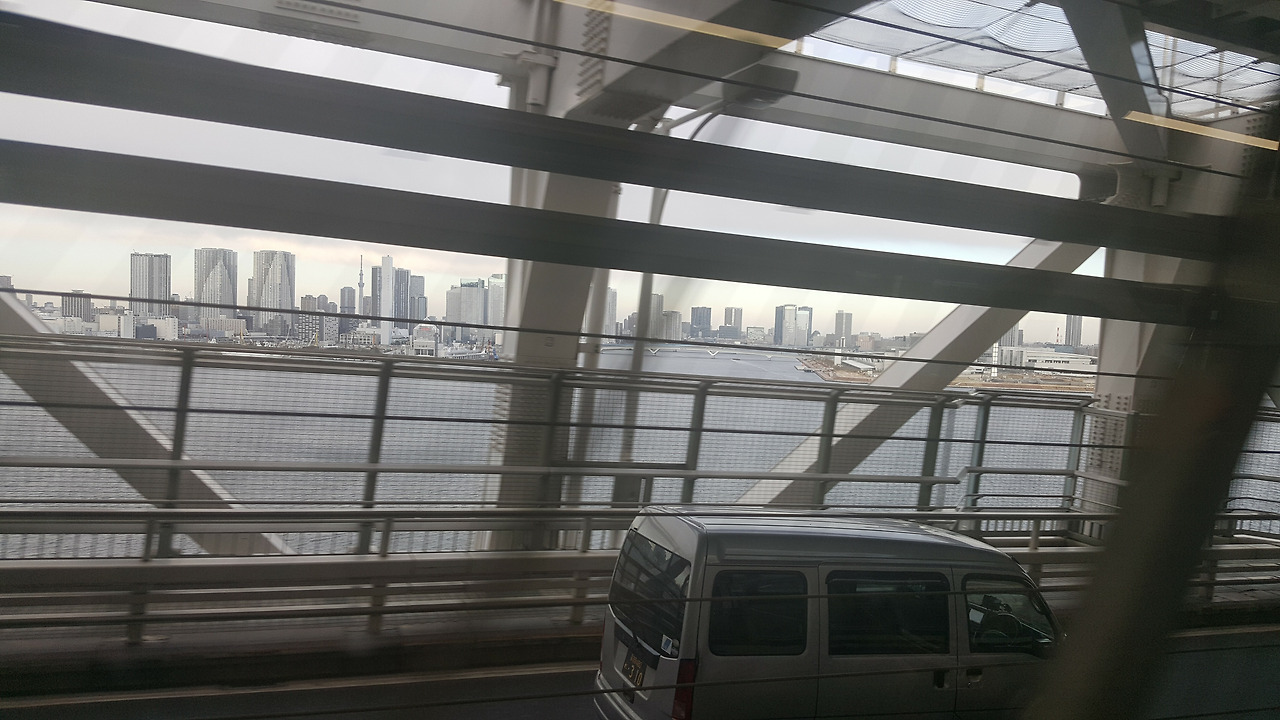 돌아오는 유리카모메는 더욱더 예뻤다. 맨 앞자리는 저렇게 뚫려 있어서, 정말 관람차를 타는 것 같은 느낌으로 주위 풍경을 감상할 수 있었다. 게다가 기관사 옆 자리는 비어있는데, 사진처럼 승객이 앉아서 가는 것이 가능했다. 친구가 어디에선가 유리카모메는 맨 앞자리에 앉아서 가라는 말을 들었다고 했는데, 그것이 맨 앞 칸이 아니라 바로 저 기관사 옆 자리를 가리키는 말이었던 것 같다는 이야기를 했다. 저 자리에 앉으면 영락없이 관람차를 타는 기분이 되지 않았을까 싶다. 석양이 지는 오다이바를 가로지르는 유리카모메 안에서, 도쿄 여행의 3일 차가 후반부로 접어들고 있었다.