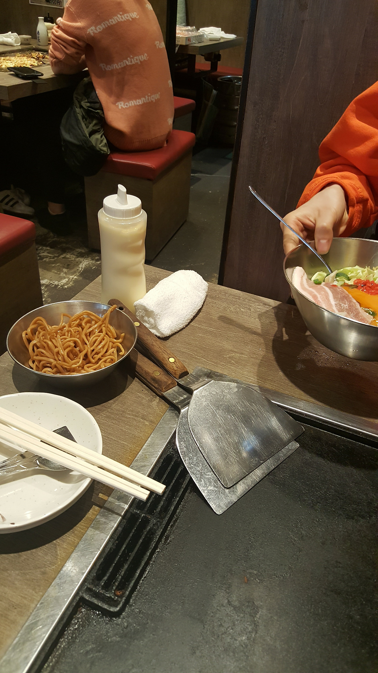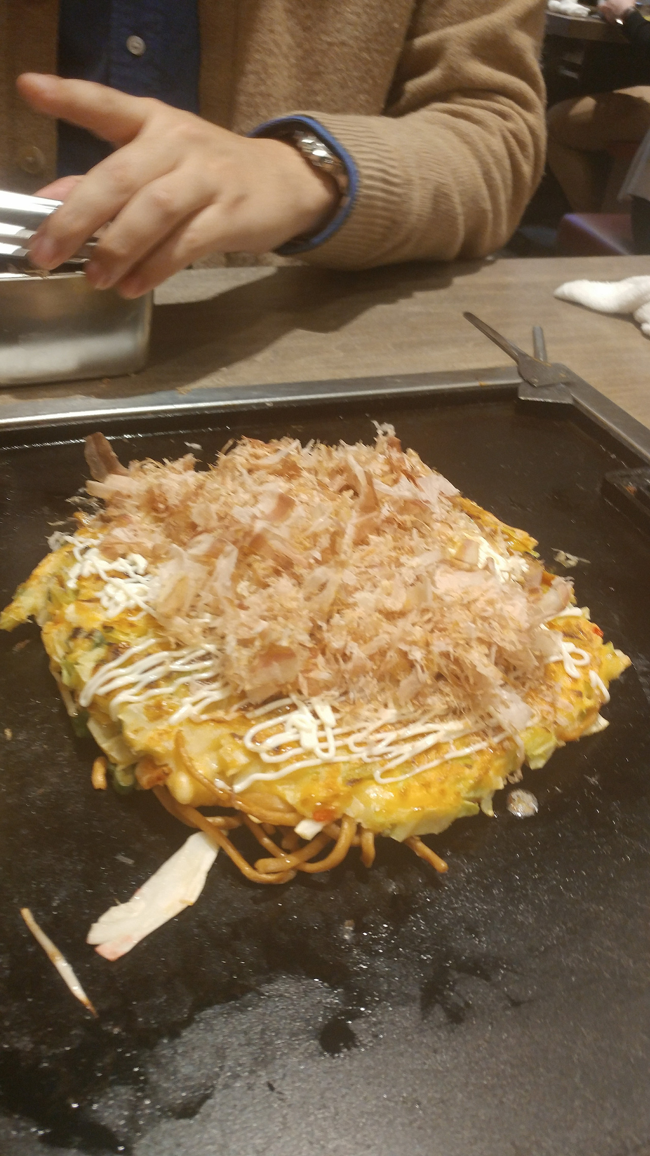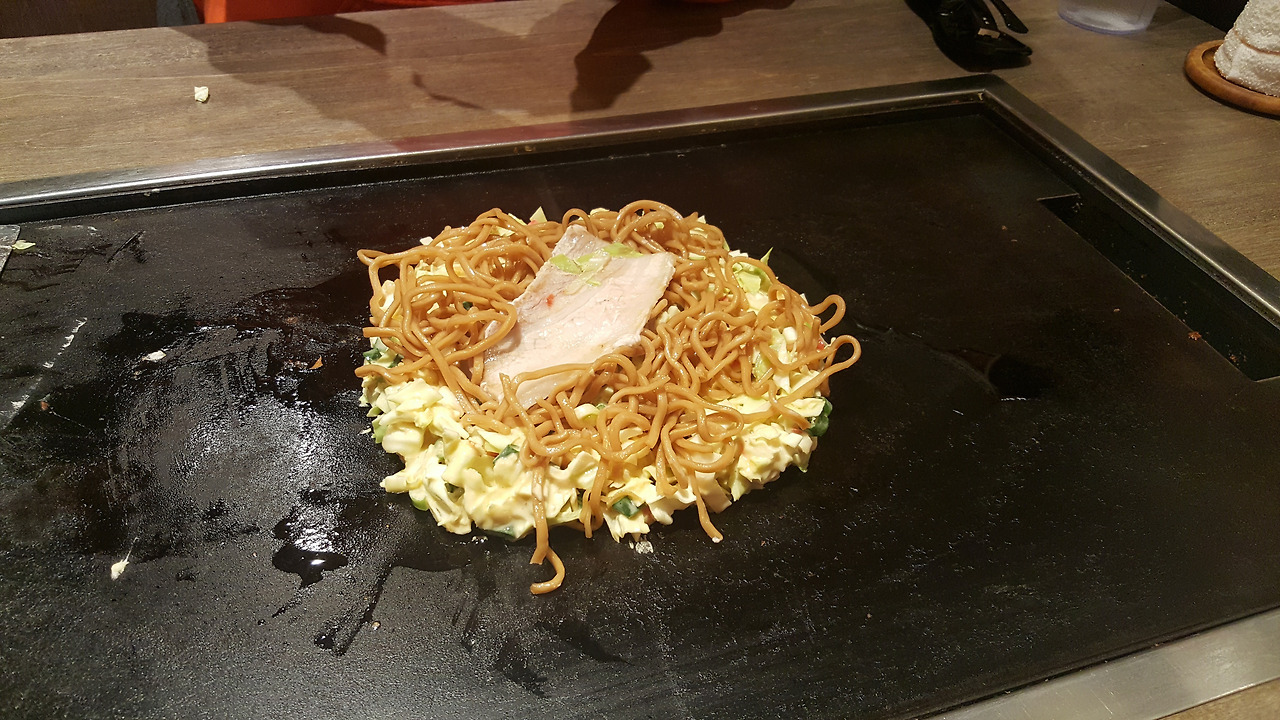 뜨겁게 달궈진 거대한 철판, 쇠로 된 뒤집개까지. 비주얼은 영락없이 드라마에서 봤던 그것과 같았다. 설렘이 고조되었다. 이제 곧 내 앞에 맛있는 오코노미야키와 야키소바가 놓이겠지, 하는 생각에 즐거워졌다. 그런데 생각지도 못한 난관이 닥쳤다. 종업원이 오코노미야키 반죽과 야키소바 재료를 담은 접시를 철판 옆에 놓고 가버린 것이다. 설마 해서 주변을 둘러보니 가게 안의 모든 사람들이 자신이 주문한 것을 직접 굽고 있었다. 당연히 구워줄 거라고 생각하고 들어간 것이었는데... 겨우 이야기해서 반죽을 굽고 뒤집는 정도까지는 도움을 받았지만, 그 위에 소스라던가 토핑을 뿌리는 것, 그리고 야키소바를 굽는 것은 고스란히 우리가 해야만 했다. 뒤집개는 작은 것을 써야 하는지 큰 것을 써야 하는지, 소스는 어떻게 뿌려야 하는 건지, 결혼 못하는 남자에서 쿠와노 씨가 굽던 장면을 머릿속으로 더듬으며, 이따금은 옆 테이블의 여학생들이 하트 오코노미야키를 만들며 깔깔대는 것을 힐끗힐끗 바라보며 참고하면서, 태어나서 처음 해봤기 때문에 어설플 수 밖에 없는 오코노미야키와 야키소바를 만들었다.