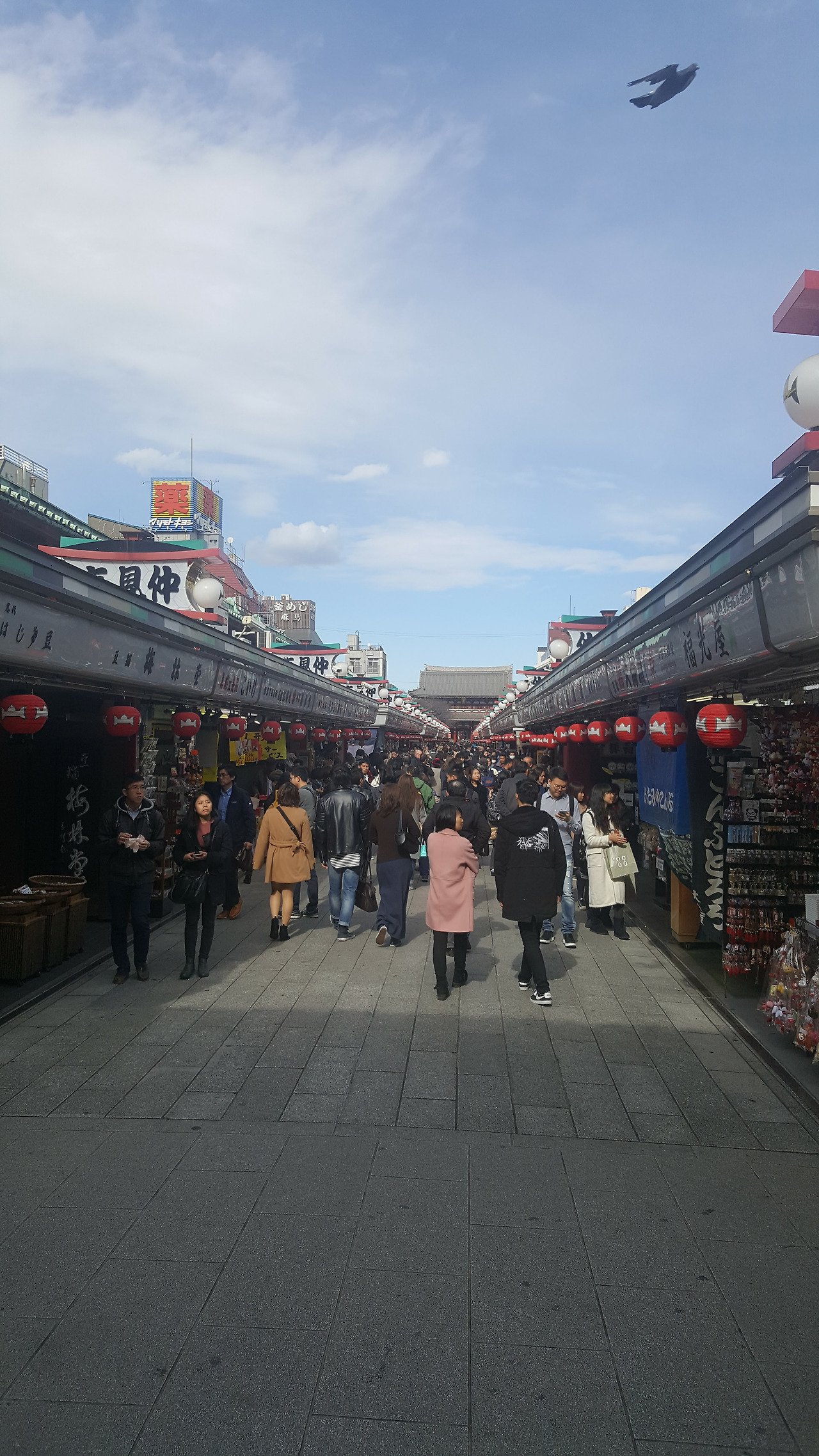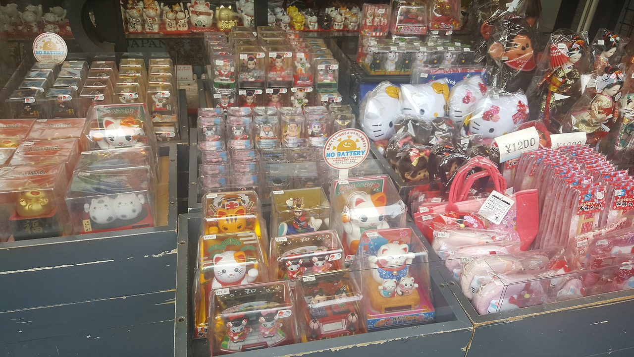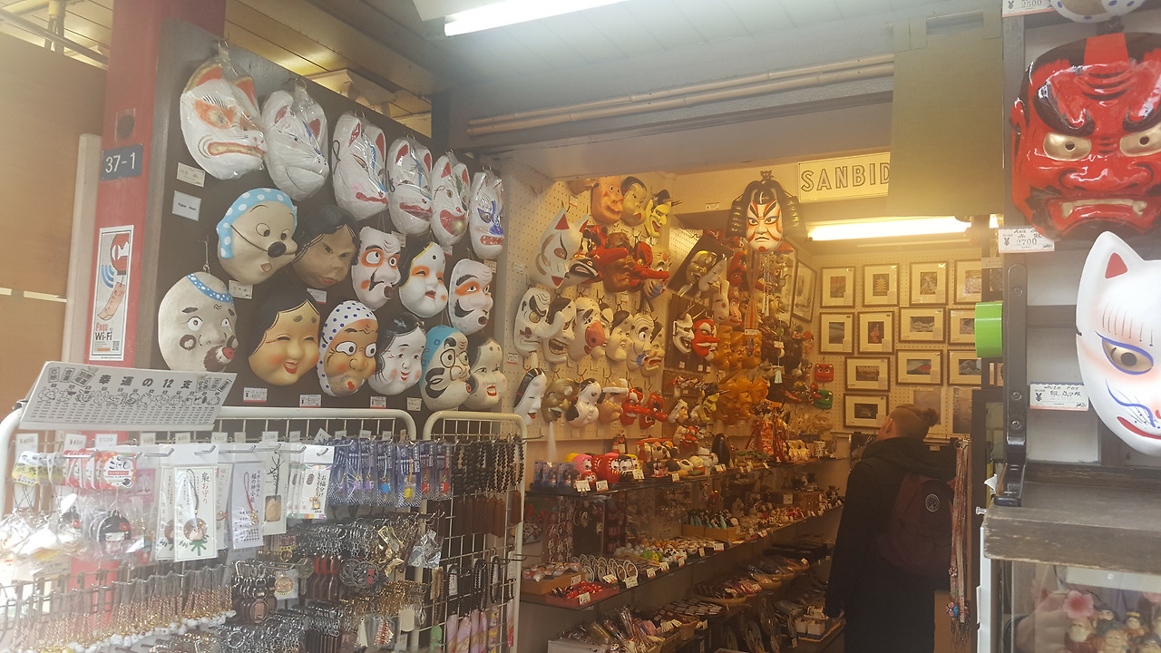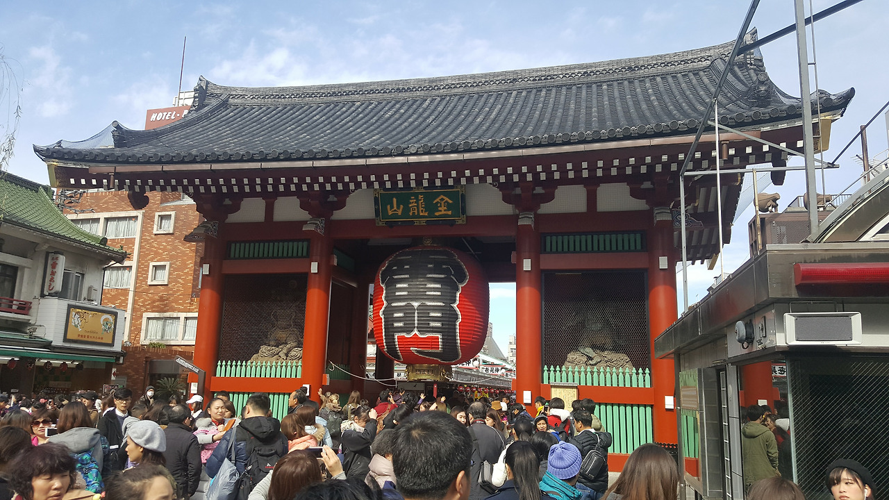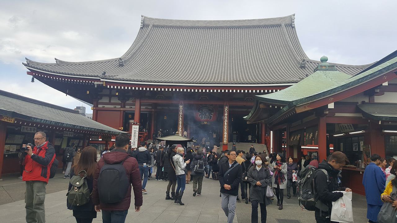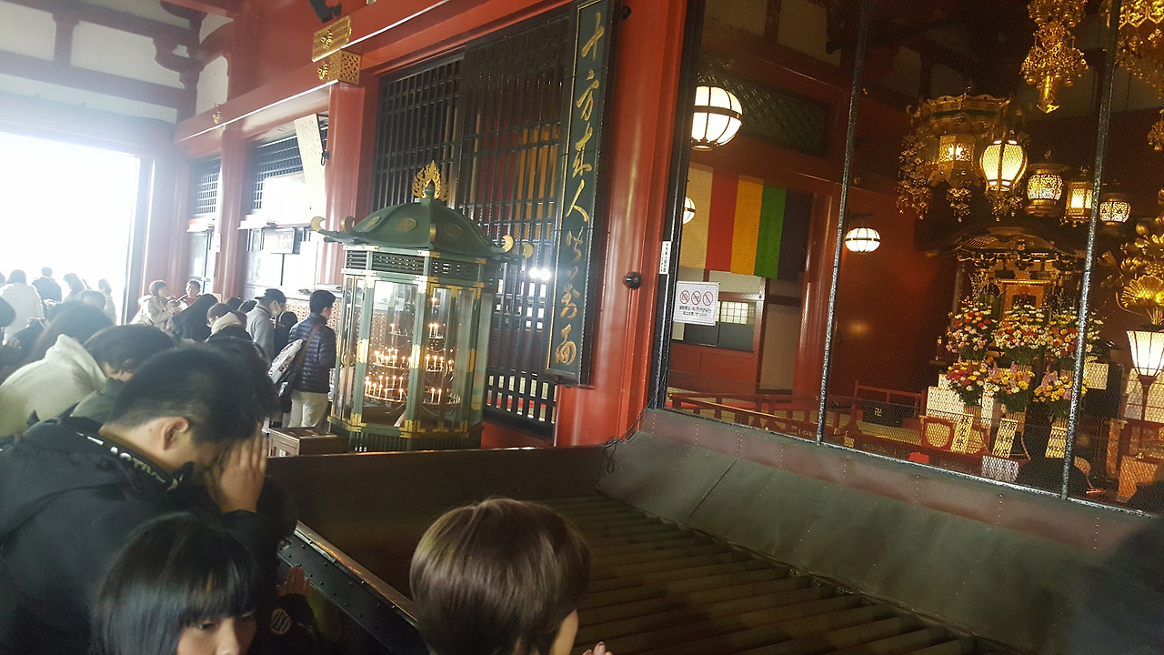 드디어 아사쿠사. 신사의 입구부터 관광객들로 발 디딜 틈 없었다. 패키지 관광에서 흔히 볼 수 있는, 깃발 같은 것을 들고 메가폰을 사용하고 있는 가이드, 그리고 그 뒤로 들어선 백팩과 등산복 차림의 관광객들. 어제까지는 자유 여행답게 관광 코스보다는 우리가 가고 싶은 곳 위주로 다녔었는데, 오늘은 여행이라는 단어보다는 관광이라는 단어가 어울릴 것 같은 장소에 왔기 때문일까, 마치 패키지 관광의 일원이 된 기분을 느꼈다.