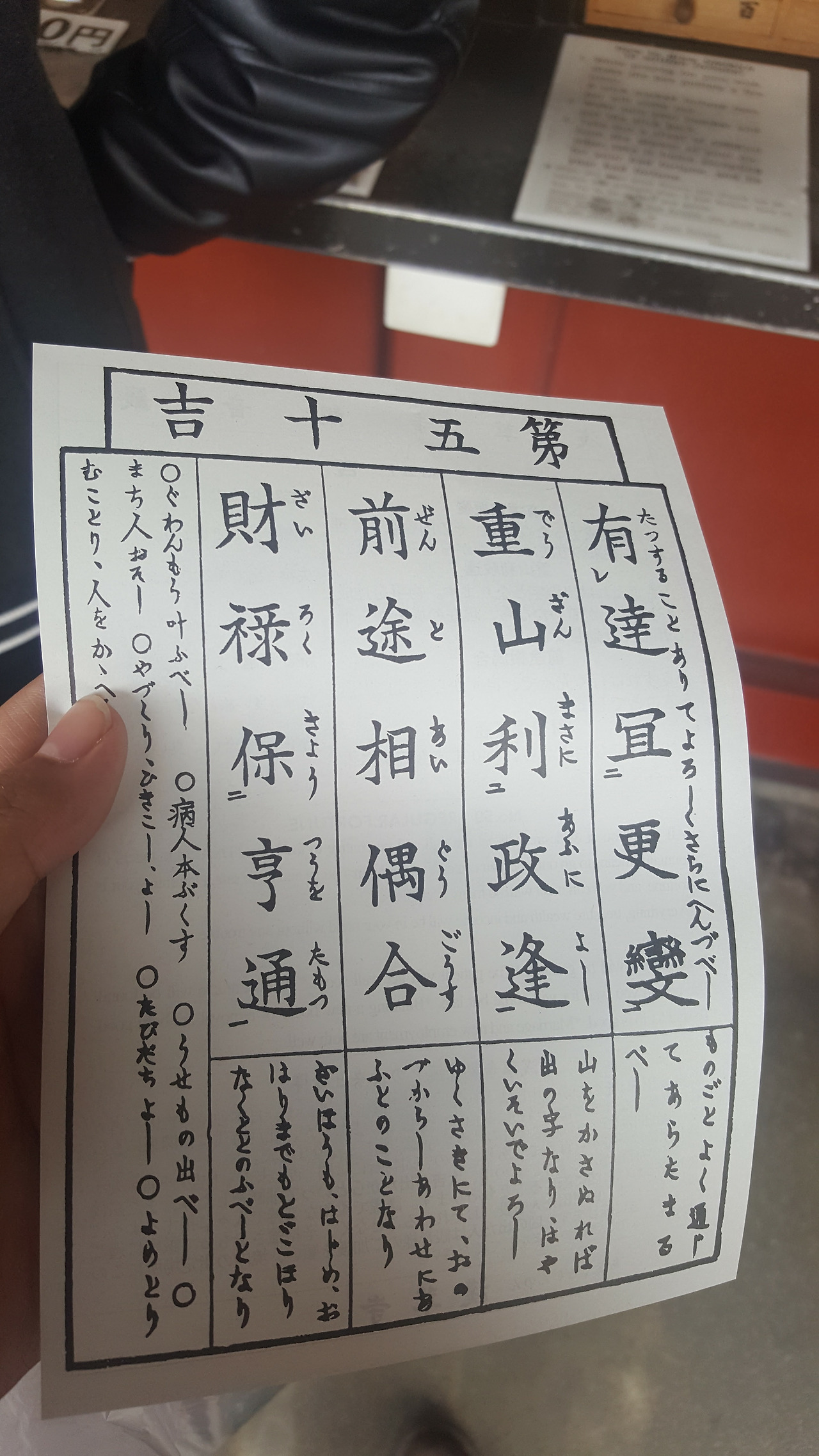 내부 곳곳에 점을 볼 수 있는 시설이 있었다. 흔히 미디어에서 봤던, 쇠로 된 통에 나무젓가락 같은 것이 잔뜩 들어있고, 그것을 흔들어 젓가락 하나를 뽑고, 젓가락에 적힌 숫자에 맞는 서랍을 열어 맨 윗장의 종이를 꺼내 운세를 찾는 방식이었다. 신기하게도 자판기처럼 동전을 넣으면 운세가 나오거나 하는 것이 아니라, 마치 양심 마트처럼, 자기가 스스로 점을 보고 알아서 돈을 넣는 구조로 되어 있었다. 종교 시설이기도 하고 자기 운세를 보는 곳이라서 돈을 안 내고 가는 사람은 없을 것 같긴 했다.