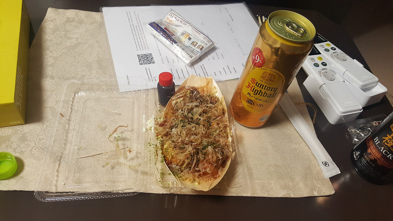 푸짐하게 먹은 라멘 때문에 포만감이 절정에 달했지만, 여행을 왔으니 먹을 것은 먹어야 한다는 생각에 오늘도 타코야키 집에 들렀다. 어제 먹기로 했던 폰즈 소스를 주문했다. 새콤한 폰즈가 끼얹어진 타코야키는 한국에서 흔히 먹는 짠맛의 소스와는 다른 매력이 있었다. 로손 편의점에서는 캔으로 된 산토리 하이볼을 샀다.
