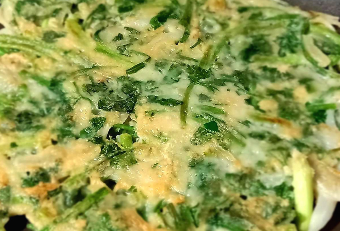 팬에 기름을 두르고 달구어질 무렵 국자 대신 손으로 반죽을 크게 집어 팬에 모양을 만들었다. 기름과 맞닿아 지지직 하는 소리와 함께 익을 준비를 한다. 주걱으로 적당히 눌러주고 위에 있는 반죽이 적당히 수분기가 사라져 갈 무렵 뒤집으면 알맞게 익은 상태다. 밀가루를 만난 미나리가 예쁘다. 양파를 조금 넣어주니 미나리의 초록이 더욱 빛난다.