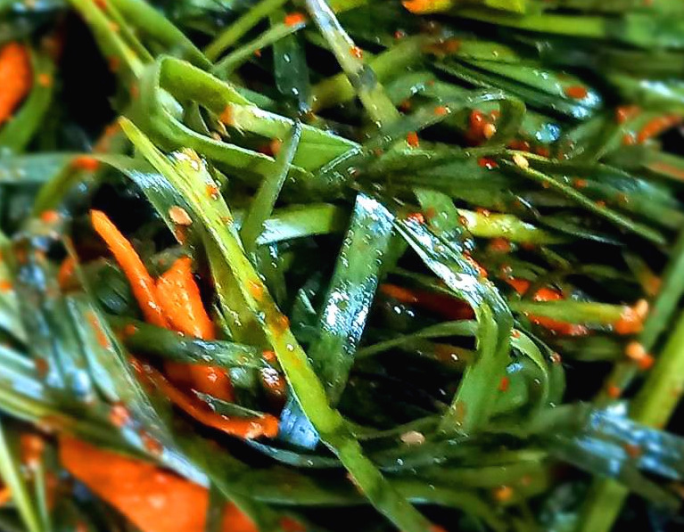 김장 때 남은 양념을 꺼내고 부추를 얼른 씻어 채에 받혔다. 넓은 양푼에 물 빠진 부추를 넣고 양념과 멸치 액젓, 당근, 깨소금, 매실액을 넣고 비볐다. 그야말로 총알 탄 부추김치다. 접시에 수북이 올렸다. 부추의 싸하고 아삭하게 씹히는 맛, 달큰한 초록의 향이 올라온다.