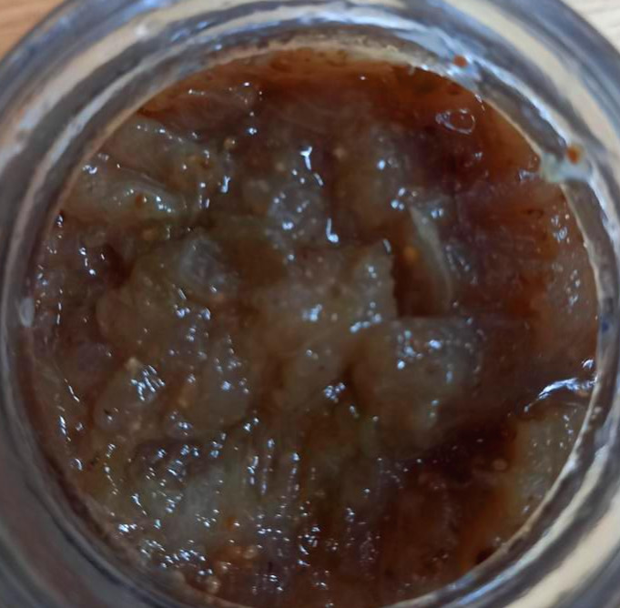 물에 살짝 씻고는 나무에 매달려 있던 줄기 부분을 칼로 잘라낸 다음 듬성듬성 썰었다. 잼이라고 하지만 얼마 동안만 먹을 수 있도록 조려내는 과정이다. 조금 있으니 물이 나오고 물컹이기 시작한다. 설탕을 밥숟가락으로 3개를 넣고는 휘휘 저었다. 끓기 시작한 뒤라 약한 불로 놔두면 그만이다.