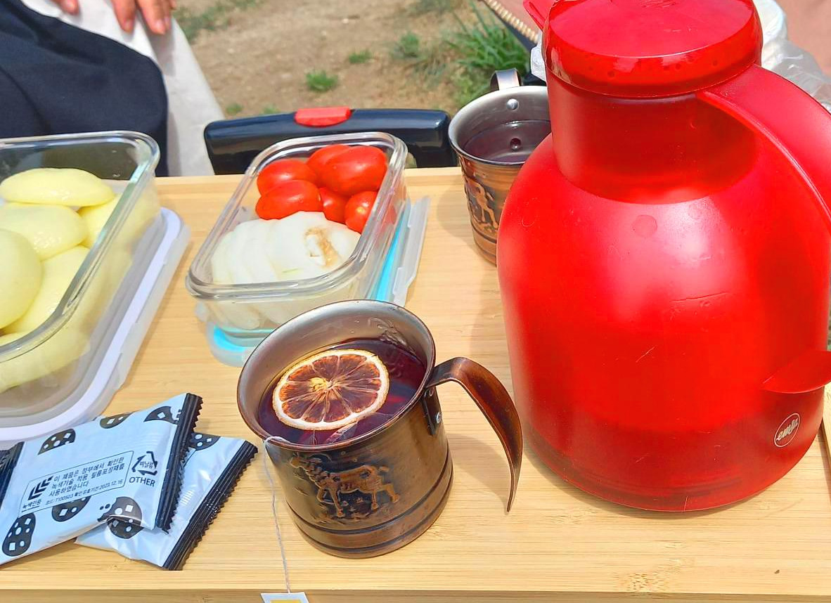 집 밖으로 나가면 가끔 새로운 세상을 경험한다. 문 열지 않은 책방 앞마당에서 차 한 잔이 그랬다. 지난해 갔던 곡성 품 안의 숲은 10시 반에 문을 여는 줄 알았는데 시간이 바뀌어서 두 시간 후에나 가능했다. 주차장에 차를 세워놓고 즉석 카페를 만들었다. 캠핑 의자 3개를 펼쳐놓고 테이블도 꺼내어 둘러앉았다. 각자가 가져온 먹거리를 꺼냈다. 떡과 쿠키, 과일이 오르니 자연 속 초록 카페가 만들어졌다. 졸졸 흐르는 계곡 물소리는 지쳐있는 마음을 시원하게 훑고 지났다. 제법 물기를 잔뜩 머금은 찐득한 흙냄새와 나무와 풀 향기가 경직된 몸을 깨운다. 빨간색이 고운 보온병에 물을 컵에 부어 차를 만들었다.