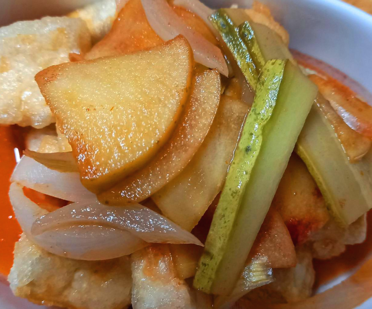 두부를 깍둑썰기해서 전분을 묻힌 다음 기름에 노릇하게 튀겼다. 집에 있는 오이와 사과, 양파를 넣고 소스를 준비했다. 물과 간장, 매실청, 식초, 요리당 그리고 빼놓을 수 없는 케첩을 넣고 잘 저어주고는 보글보글 끓인다. 마지막에 전분 물을 넣어야 하는데 두부에 쓰느라 남은 게 없다. 그래도 케첩의 끈적함은 그럭저럭 괜찮은 농도를 만들어 주었다.
