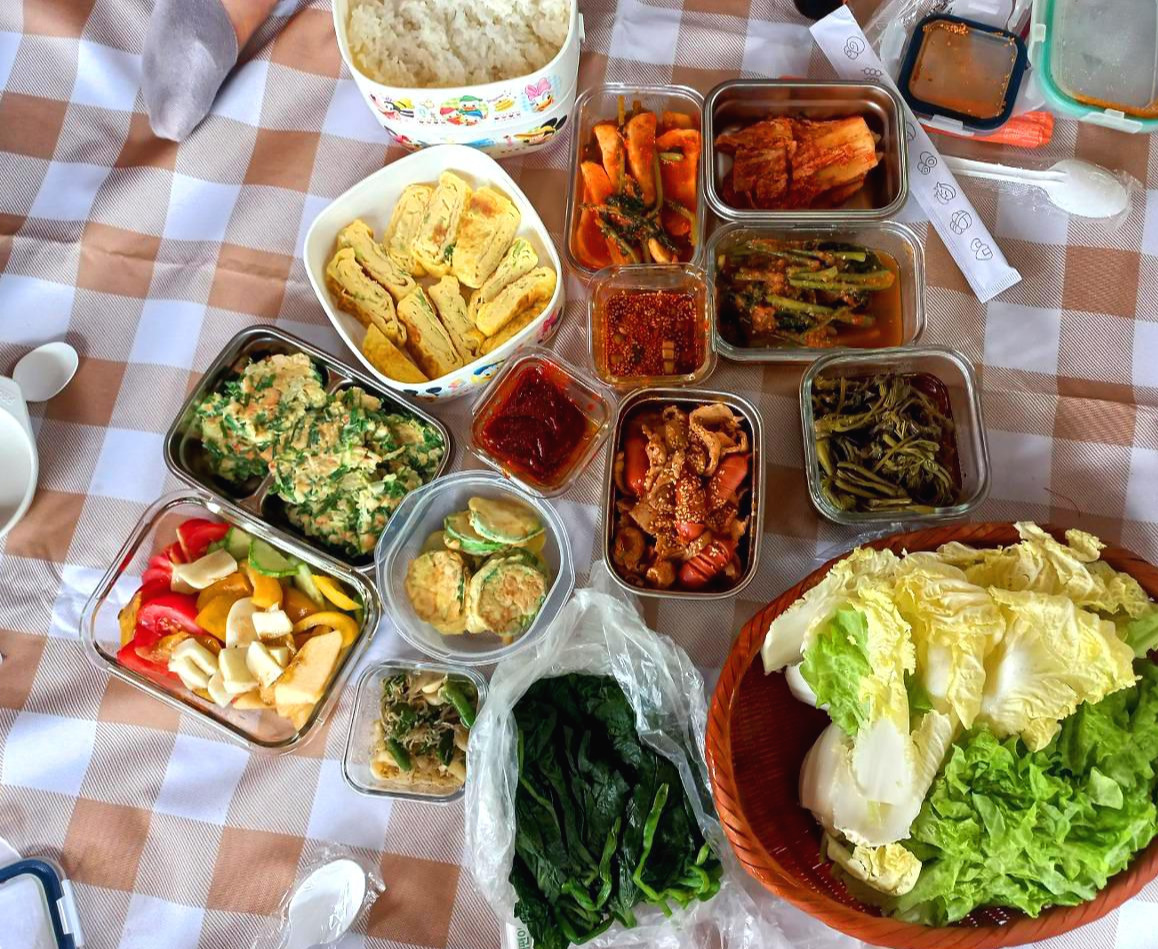 멀리 산이 보이고 논은 모내기를 마쳤다. 아직은 비어있는 듯한 논의 풍경이 여유 있다. 시원한 바람이 불어오고 뻐꾸기 소리가 가까운 곳에서 들린다. 적당한 고요 속에 쉼 없는 생명의 소리였다. 각자의 가방에서 준비해온 것들을 하나씩 꺼낸다. 총각무 김치와 애호박전, 제육볶음과 멸치볶음, 열무김치에 계란말이다. 대나무 작은 광주리에는 집에서 키웠다는 상추와 배추 여기에 찐 호박잎이다.