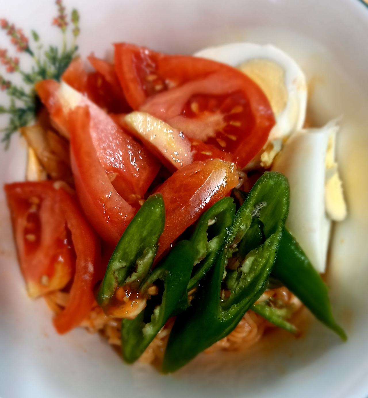 내게 미안한 생각이 들면서 비빔면에 몸에 좋은 것과 내가 좋아하는 것을 넣기로 했다. 나를 거쳐 간 비빔면 최초로 토마토를 넣었다. 여기에 양파와 풋고추를 채 썰어서 고명으로 했다. 냉장고에 있던 삶은 달걀도 함께다. 냉면 그릇에 담아 들고는 텔레비전을 켜고 거실 중앙에 앉았다.