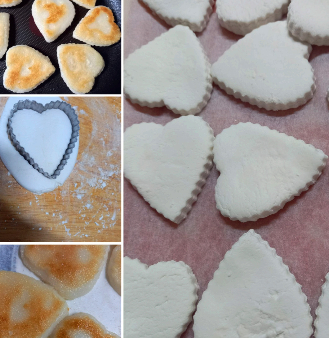 우리 집 아이에게도 몇 년 전에 만들어 주었다. 그러다 해를 몇 번 넘기고 나서야 다시 시작하게 되었다. 찹쌀을 8시간 불린 다음 동네 떡집에서 가루로 갈아왔다. 이른 아침 5시 무렵에 찹쌀 2킬로그램을 씻는데 우유 빛나는 쌀뜨물 색에 놀랐다. 참 고운 흰색에 버리기가 아까워 화분의 주기로 하고 따로 두었다. 정통 기름떡 틀이 없으니 쿠키 만들 때 쓰던 하트 틀을 사용하기로 했다. 우유와 미지근한 물을 넣고 반죽해서 밀대로 밀고 틀로 찍어내는 데 하트가 하나둘 늘어났다. 하얀 하트를 처음 만나는 날이었다. 어색할 것 같은 그 색이 참 곱다.