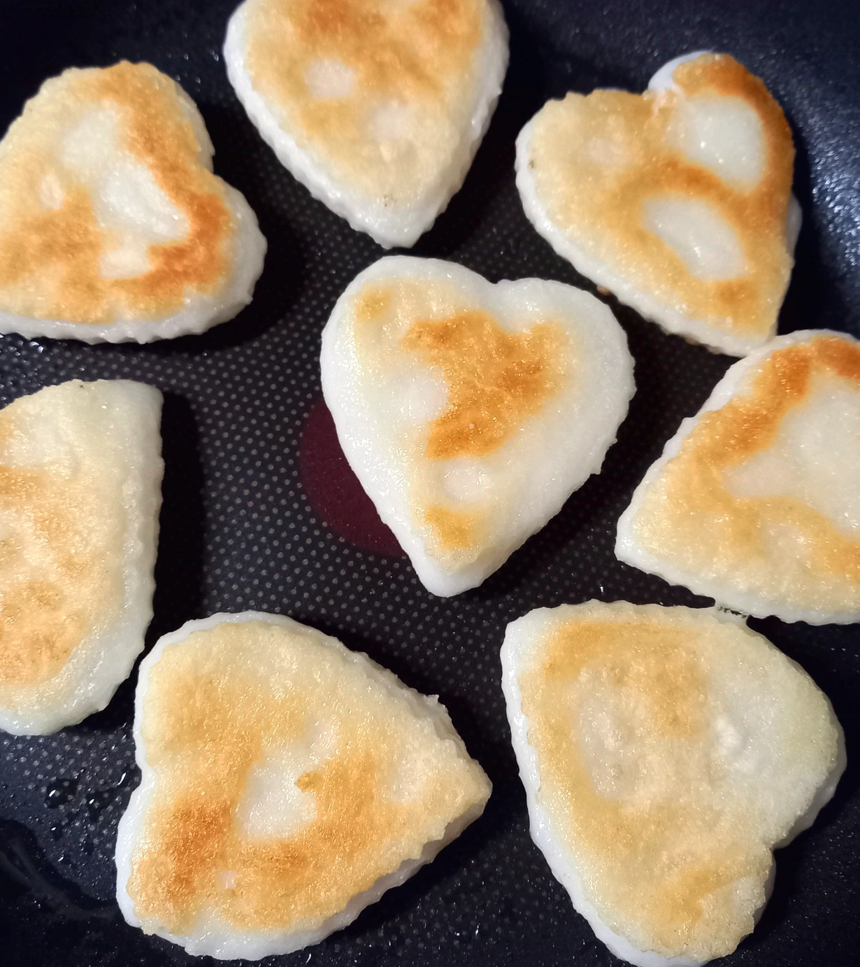얼마가 지나야 엄마의 말이 생각났다. 정말 눈 깜짝할 사이에 떡이 옆으로 퍼져나가며 하트의 모양은 희미해졌다. 간격이 조금이라도 붙어있으며 떡은 어느새 자기들끼리 친구가 되어 있었다. 두 번째부터는 떡과 떡 사이에 간격을 많이 두었다. 그래서 처음보다는 제 모습을 잘 유지했다.