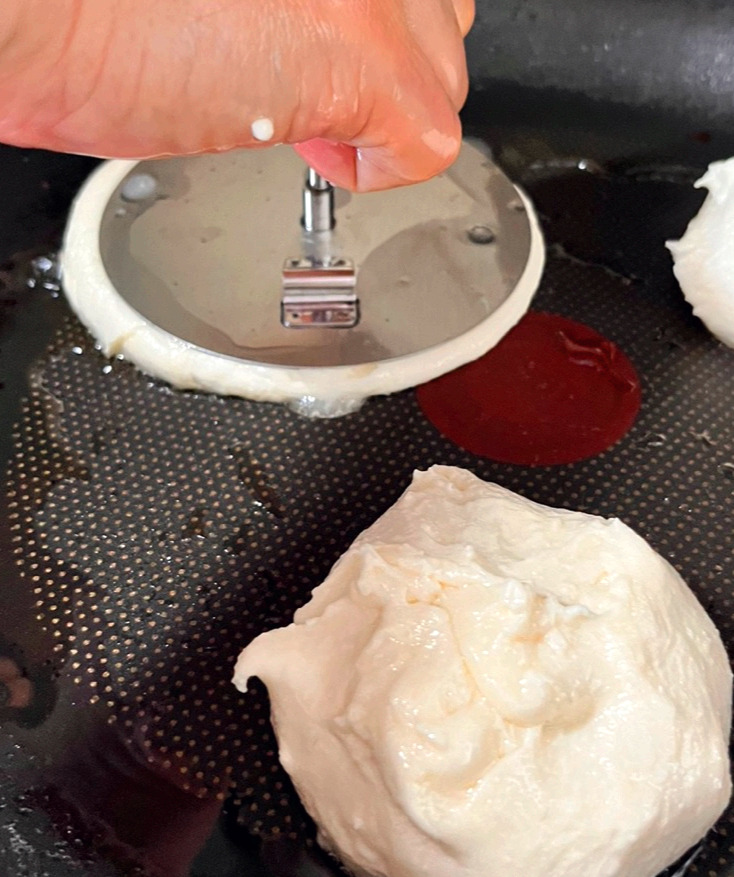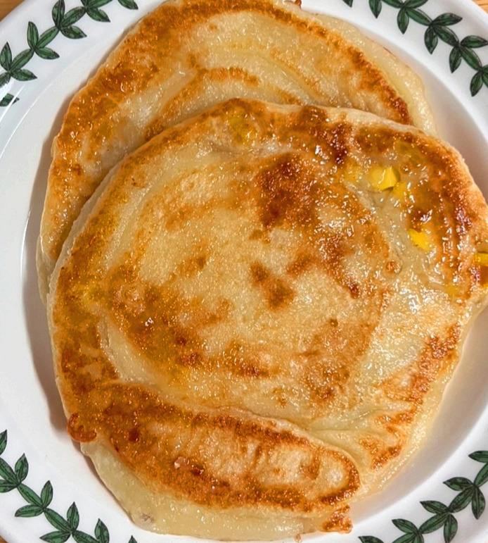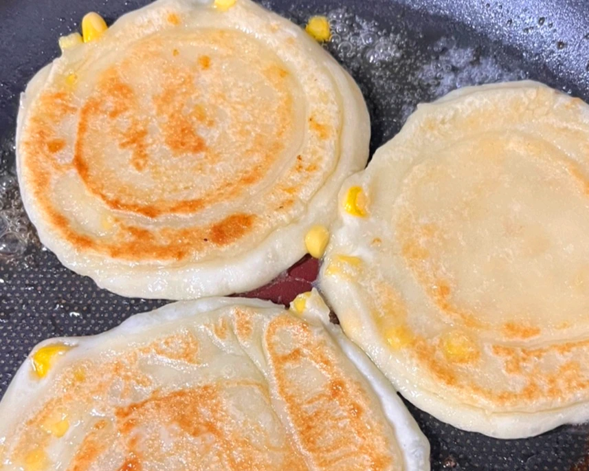 적당한 크기로 볼에 있는 반죽을 떼어낸다. 그것을 손바닥에 올려 둥근 빵 모양을 만들고 나서 가운데를 움푹 파이게 한 다음 설탕 버무린 옥수수를 한 숟가락 담았다. 그런 다음 꼭꼭 싸매서 기름을 적당히 두른 팬에 올린다. 잠깐의 숨을 고르고 나면 누르게로 꾹 눌러준다. 그러면 오돌토돌 울퉁불퉁했던 반죽이 제모습을 드러낸다.