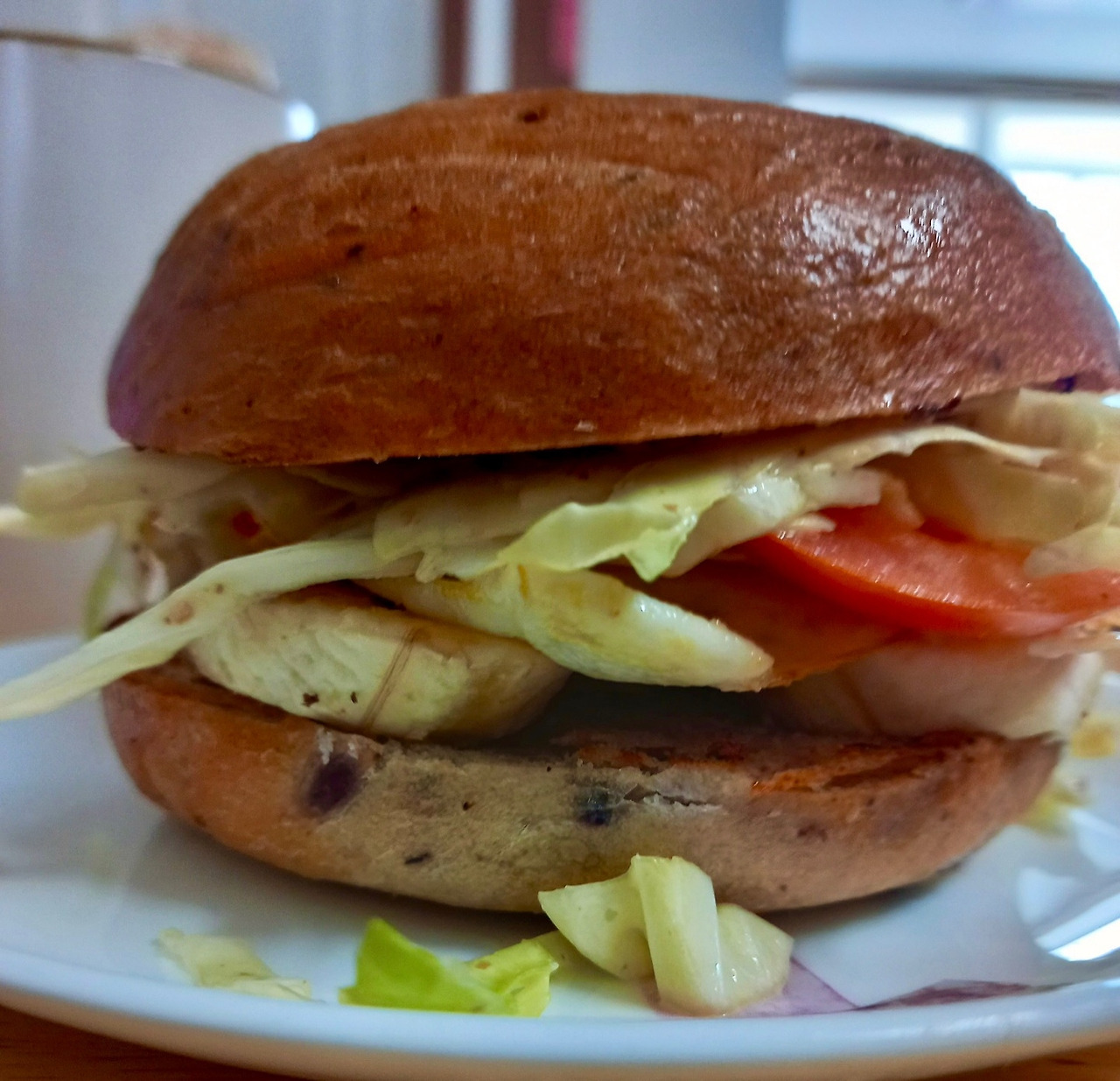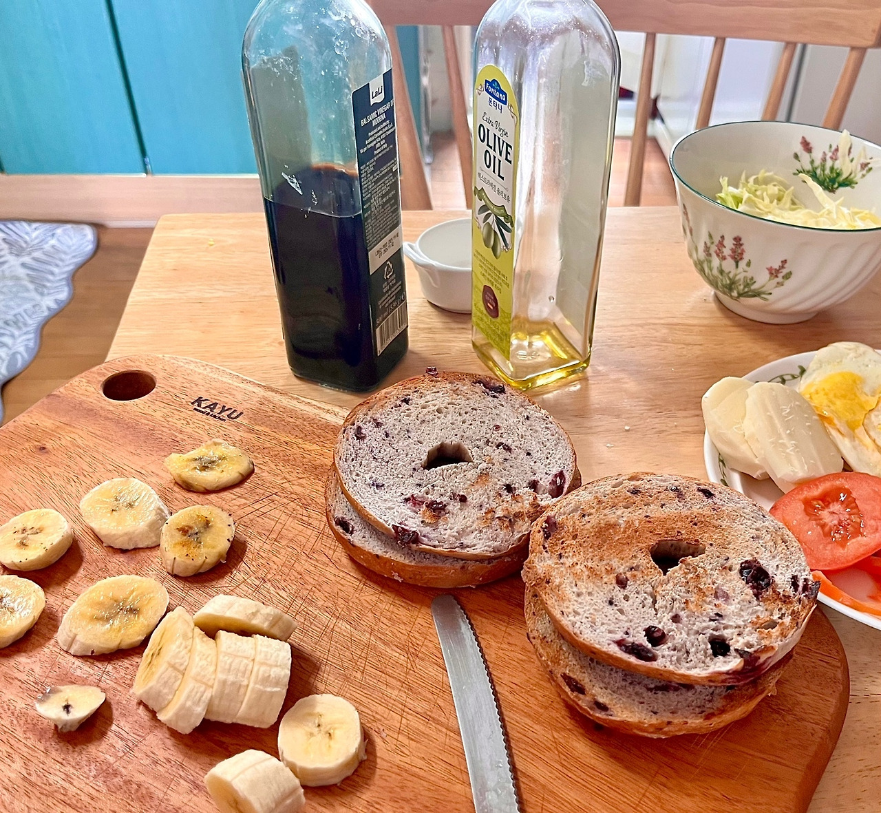 11시 반을 달려갈 무렵, 아이가 베이글을 꺼냈다. 냉동되었던 것을 전자레인지에서 30초 데우고 나서 반을 잘라 구운다. 치즈와 토마토를 준비하고 계란프라이 3개를 팬에서 만들었다. 양배추도 꺼내어 참깨 소스에 버무려 놓았다. 달콤한 바나나를 놓으면 좋을 것 같다며 구운 바나나도 준비했다. 차곡차곡 재료들을 올려놓고는 그만의 샌드위치를 선보였다.