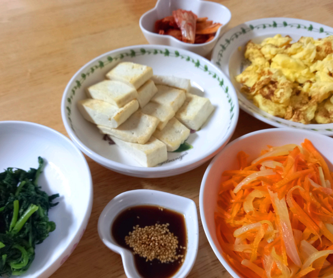 시장에 나오기 시작한 햇양파와 당근, 계란과 두부를 냉장고에서 꺼냈다. 당근과 양파는 채 썰어서 소금을 넣고 볶았다. 계란은 우유를 넣어서 스크램블에그로 했다. 두부는 먹기 좋은 크기로 들기름에 구웠다. 여기에 어제 만들어 놓은 쑥갓나물까지 더했다. 보리밥과 얼갈이된장국도 함께다.