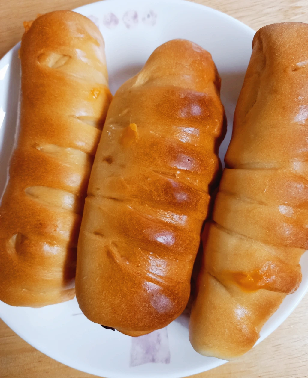 반죽이 꽤 부풀어 오를 즈음에 넓게 펴서 데쳐둔 소시지와 황색 체더치즈를 넣어서 돌돌 감았다. 영상에서 보았던 것처럼 소시지 빵 4개가 만들어졌다. 아이가 소시지 빵을 좋아해서 빵집에서 종종 샀지만 소시지 특유의 냄새와 짠맛 때문에 좋아하지 않는다.