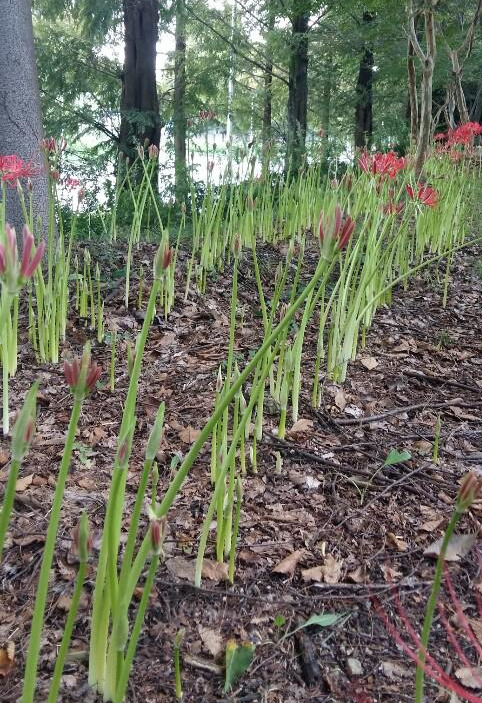 언덕 숲 작은 오솔길을 사이에 두고 소나무와 벚나무 동백나무가 우뚝 솟았다. 그 사이에 며칠 전부터 눈에 들어오던 꽃무릇이 꽃을 피우기 위해 준비하고 있다. 마음이 급한 아이들은 벌써 고운 얼굴을 내밀었다. 누가 심어놓은 것처럼 꽃무릇이 일렬로 가지런히 길을 만들었다. 기린의 목처럼 긴 줄기는 하늘을 향해 뻗어있다.