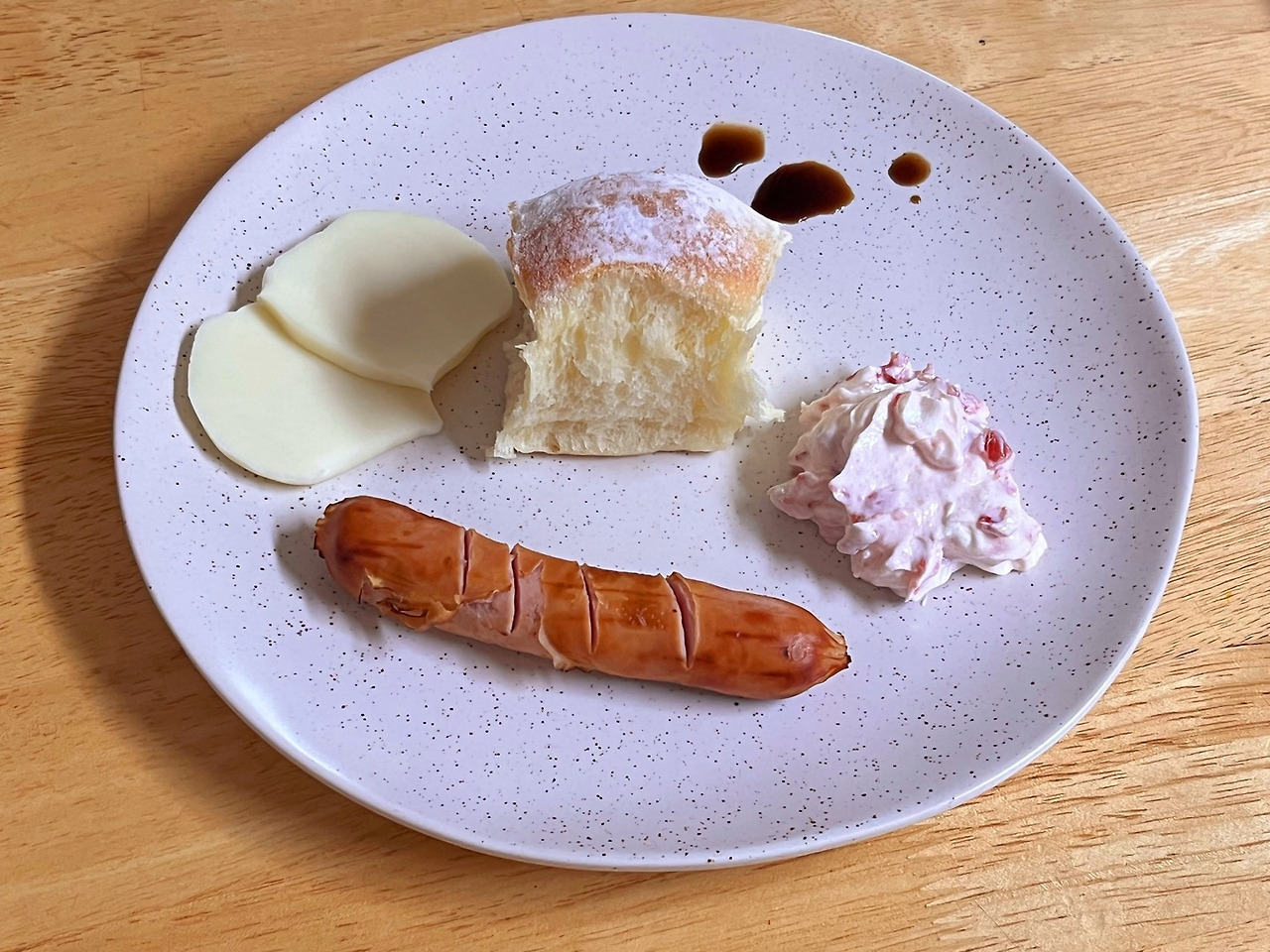 아이의 아침 식사는 한 접시에 차려졌다. 그릭요거트와 빵 한 조각, 생치즈, 구운 소시지, 빵을 찍어 먹을 발사믹과 올리브유가 전부다. 가벼워 보이지만 서로 잘 어울렸다.