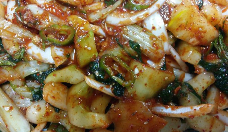 집에 오자마다 후다닥 깨끗이 씻은 다음 천일염으로 절였다. 한 시간쯤 지났을까 적당히 숨이 죽은 것을 꺼내어 씻고 본격적인 김치 담그기 돌입이다. 얼마 전 만들어 놓은 김치 양념이 남아 있어 손 갈 일이 별로 없다. 큰 양푼에 나물과 양념, 액젓과 매실을 넣고 잘 버무리면 끝이다. 양파와 친정엄마가 보내준 노각도 넣었다. 아직은 여름 기운이 남아 있어서 그런지 도톰한 노각이 아삭하게 씹히는 맛이 좋다.