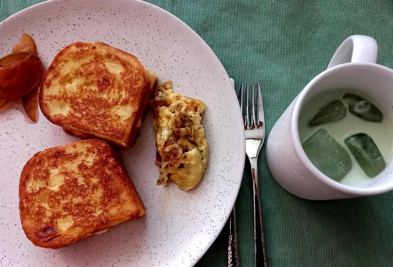 태풍으로 한결 기운이 빠진 여름 태양을 반기는 냄새다. 고소하고 평화롭고, 부드럽다. 프렌치토스트 두 조각을 접시에 올리고 남은 달걀 물을 구워서 곁들였다. 자두 청에 말차라테도 함께다. 평소에는 잘 사용하지 않는 식탁 매트도 깔아주었다.